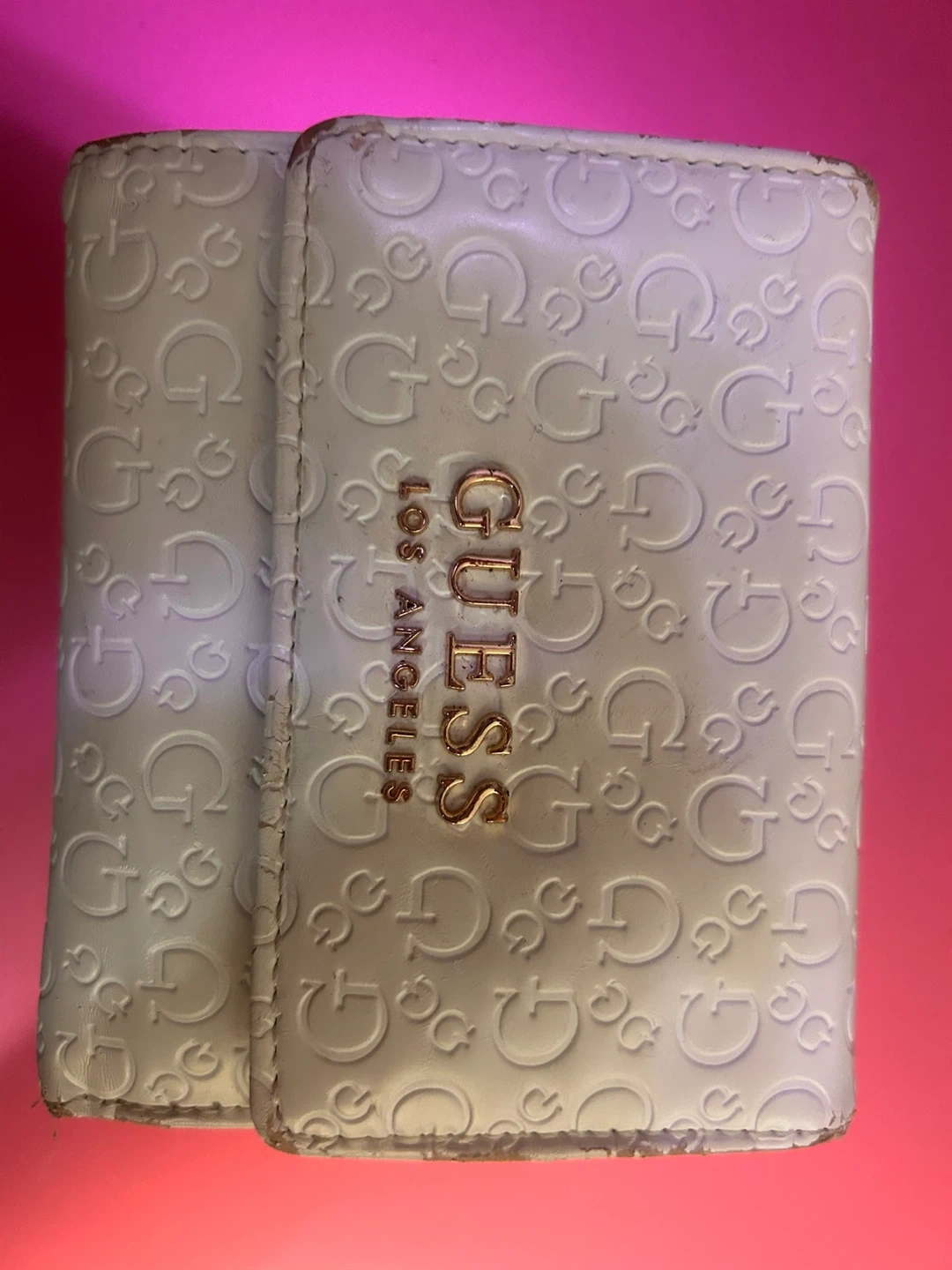 White Guess wallet with all-over G logo pattern. It has a snap closure. Made with faux leather material. Very spacious with multiple compartments