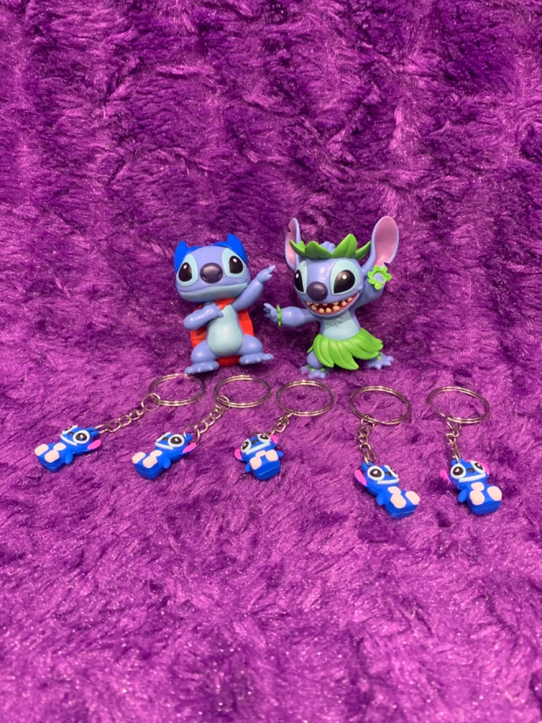 This set includes two Lilo & Stitch figurines and four Stitch keychains. The figurines depict Stitch in different outfits, and the keychains feature small Stitch charms. They're made of plastic.