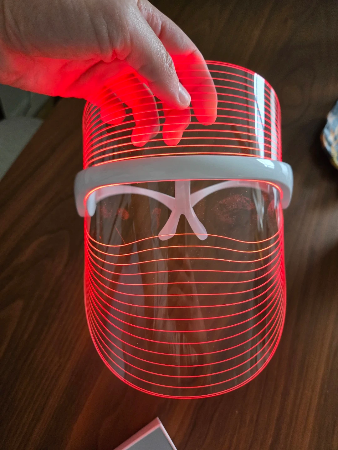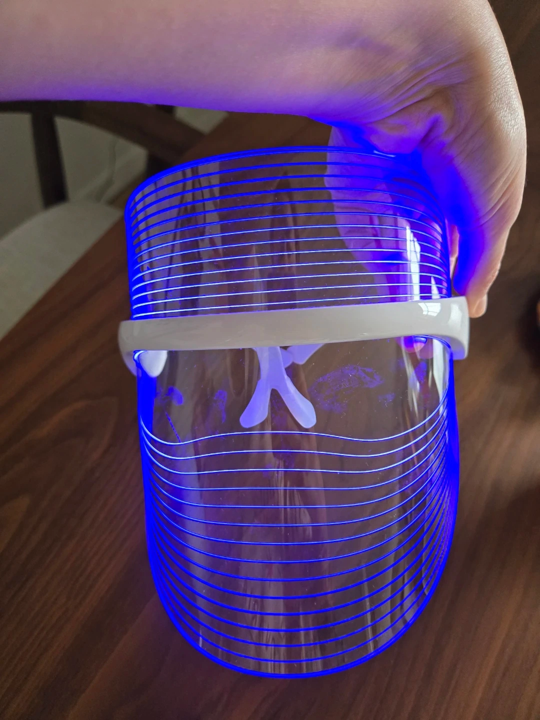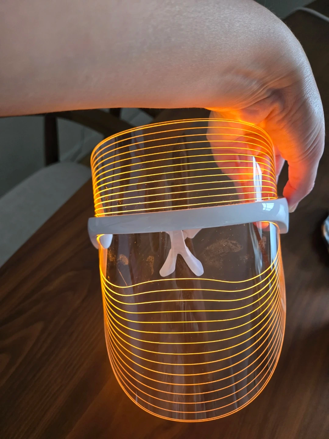 This LED Light Therapy Mask uses blue, orange, and red light. It comes with a protective case and charger. It's a great tool for skin treatments! Never used, purchased at Indigo.