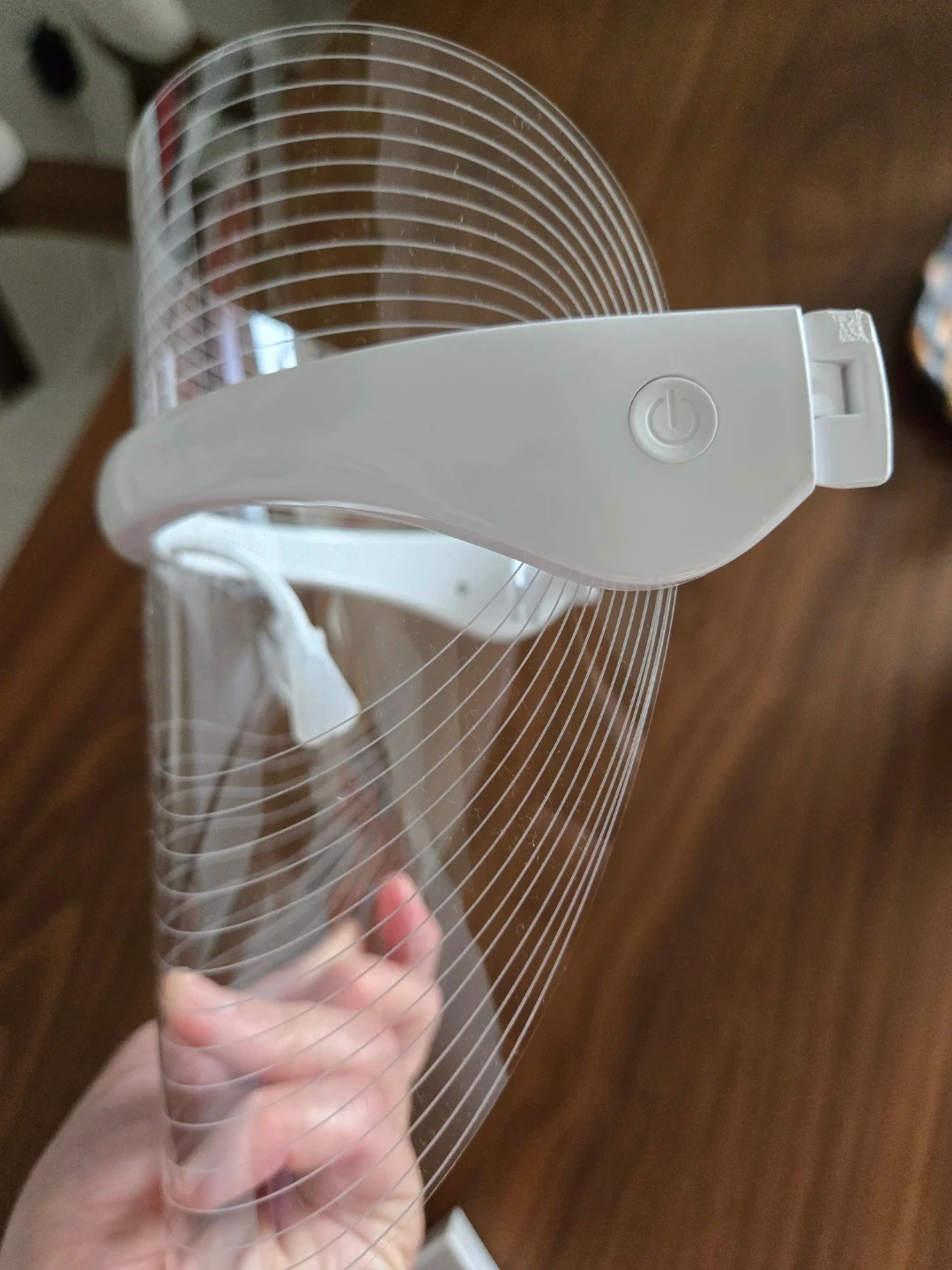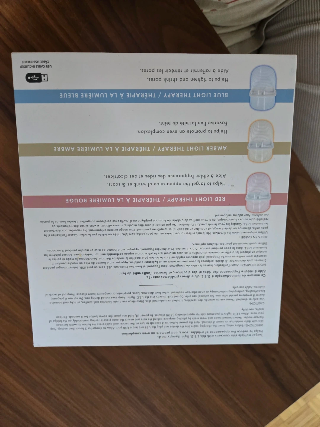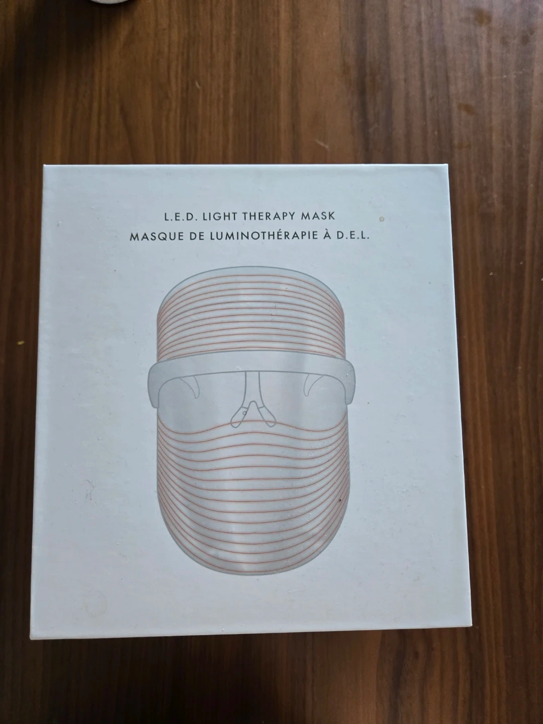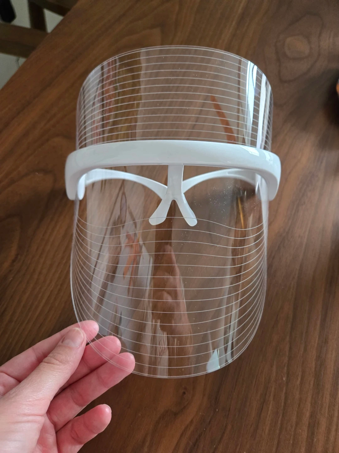 This LED Light Therapy Mask uses blue, orange, and red light. It comes with a protective case and charger. It's a great tool for skin treatments! Never used, purchased at Indigo.