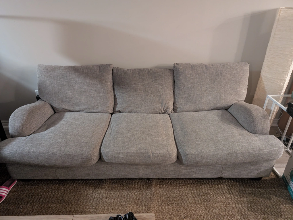 Moving Sale! Super comfortable 93 inch three-seater sofa. Grey fabric upholstery. Rounded armrests. Good condition. Lighter than you would think and covers can be removed and washed!