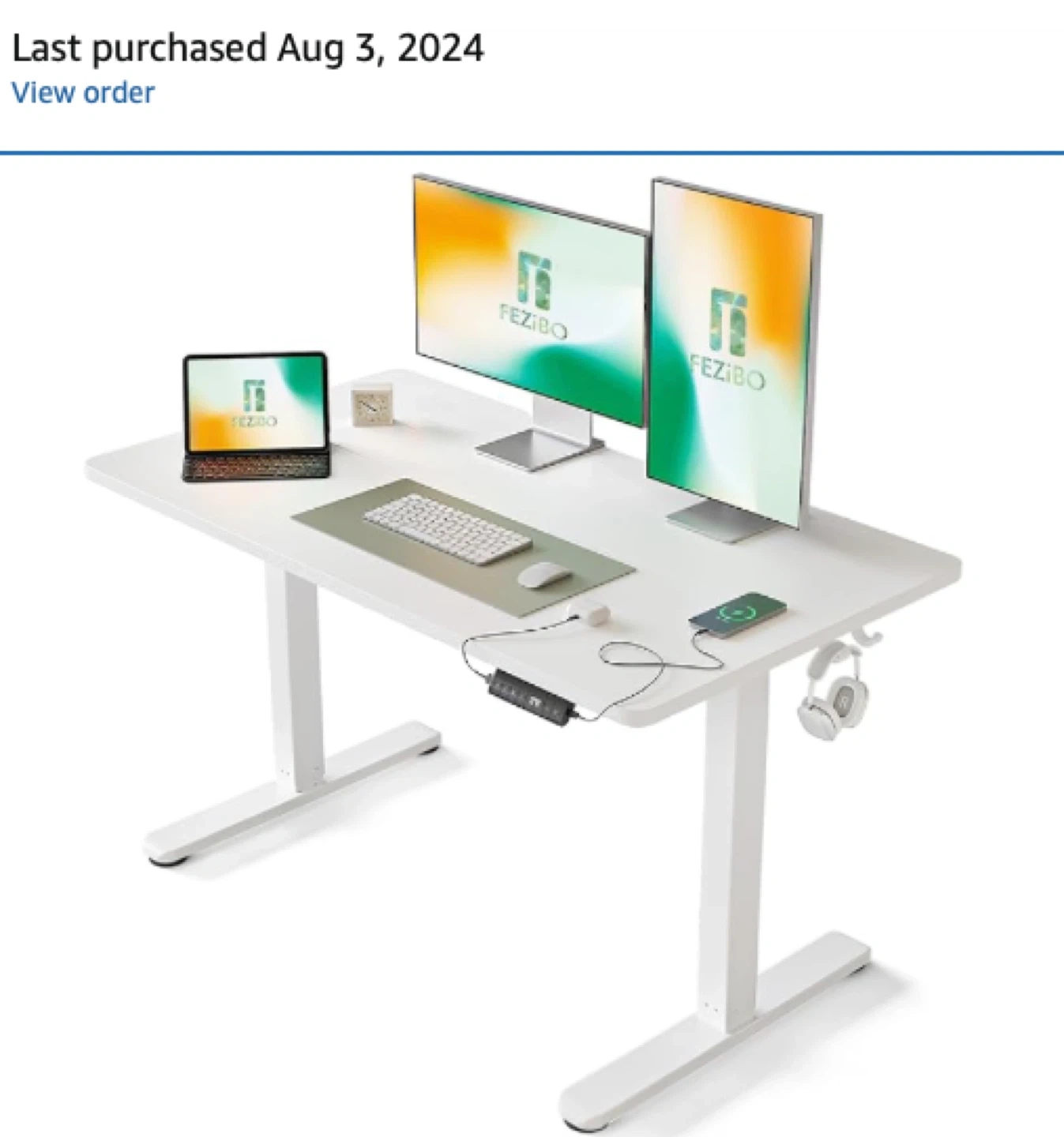 This is a white FEZIBO standing desk. It's an electric standing desk with a spacious desktop. Includes control panel and headphone hook.