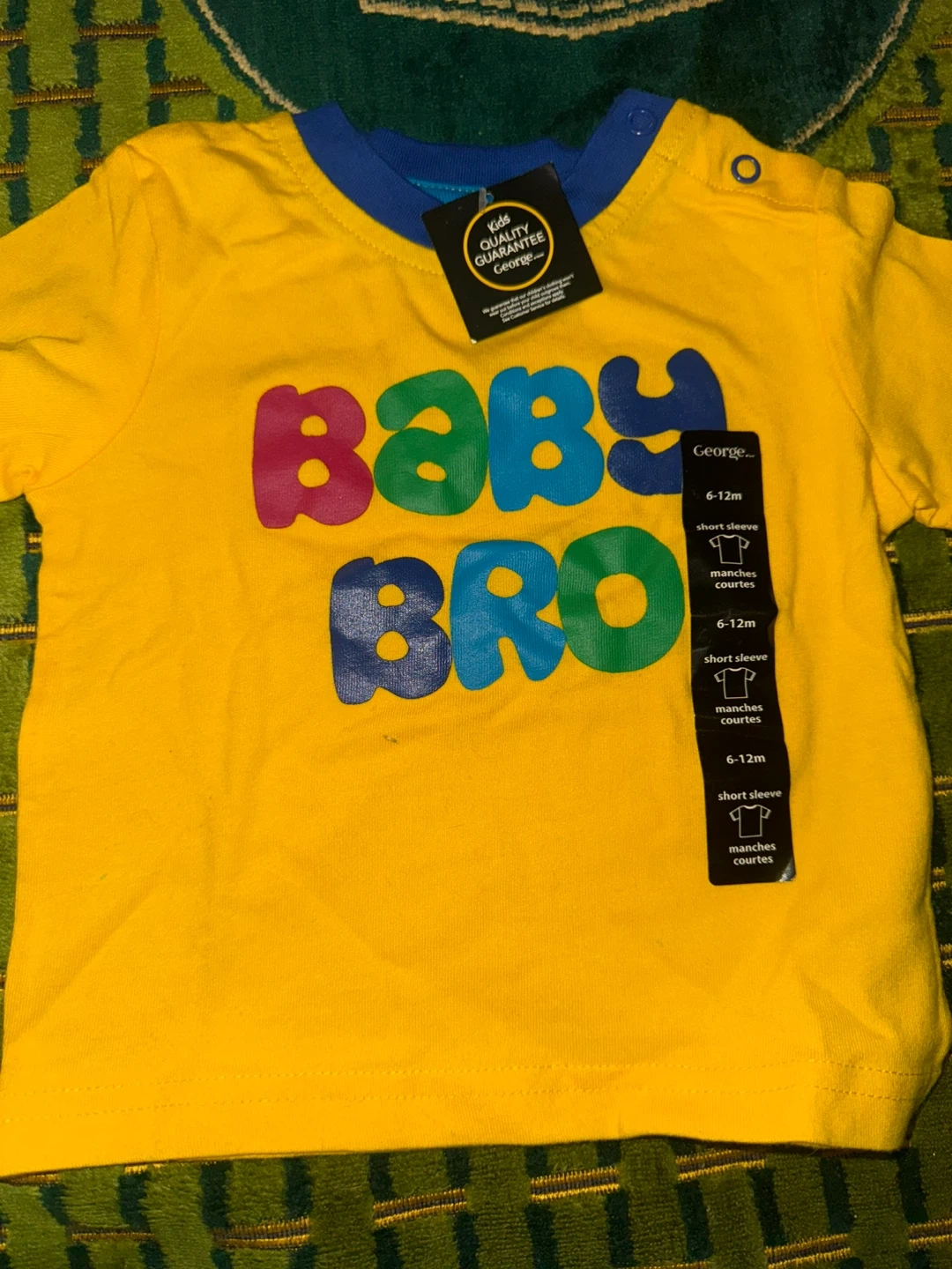 A cute yellow 'Baby Bro' t-shirt from George! This short-sleeved shirt is sized for babies 6-12 months old. Perfect for your little one