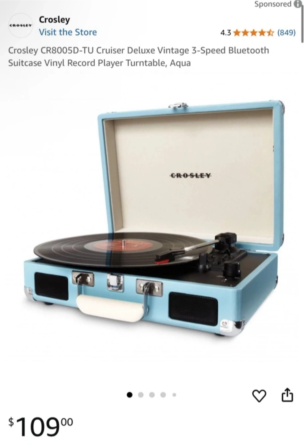 This is a Crosley Cruiser Deluxe Bluetooth record player in aqua. It features a 3-speed turntable and is housed in a hand-wrapped wooden cabinet. It includes RCA and Aux inputs, plus a headphone jack. The adjustable pitch control allows for fine-tuning playback!