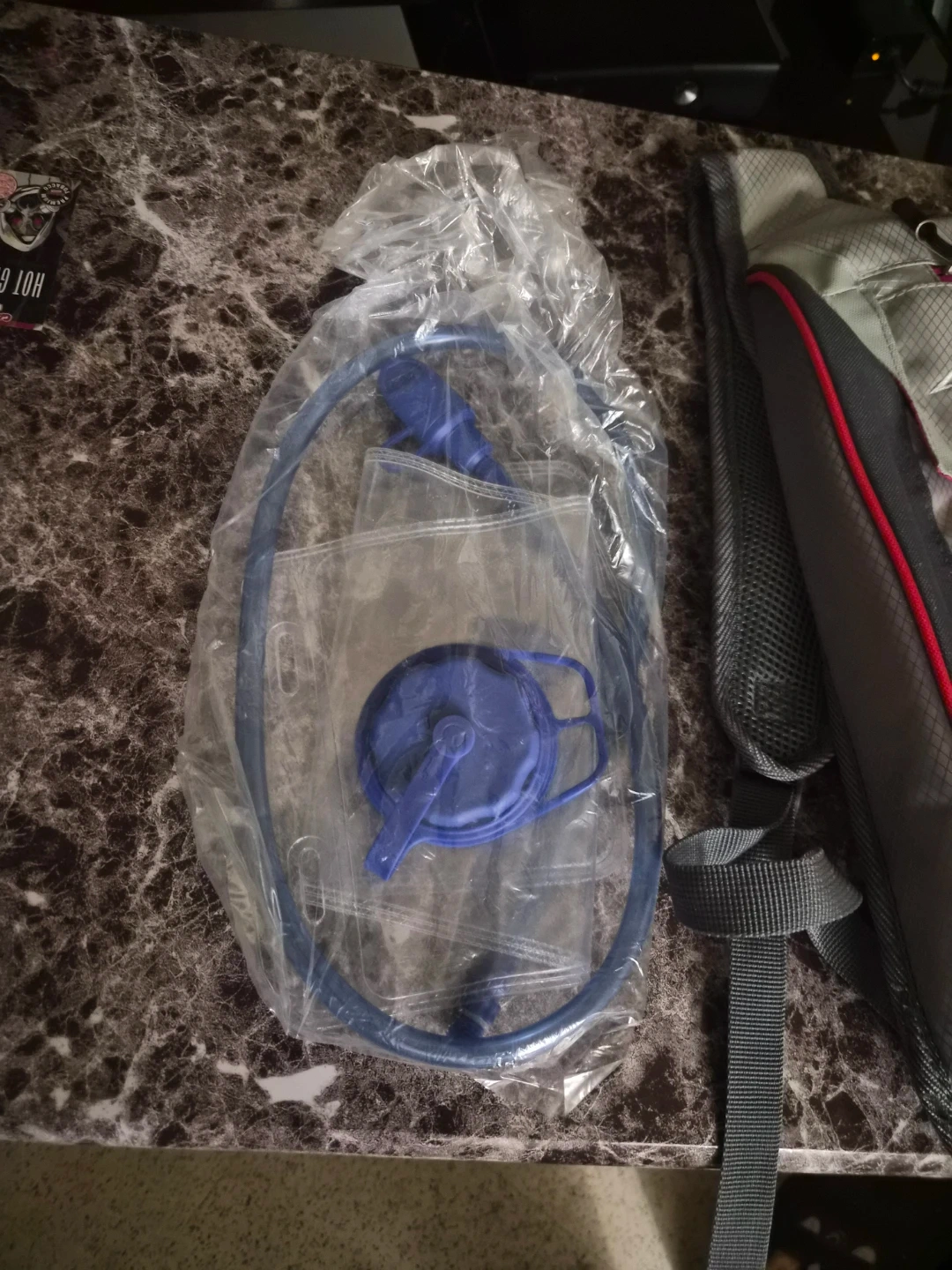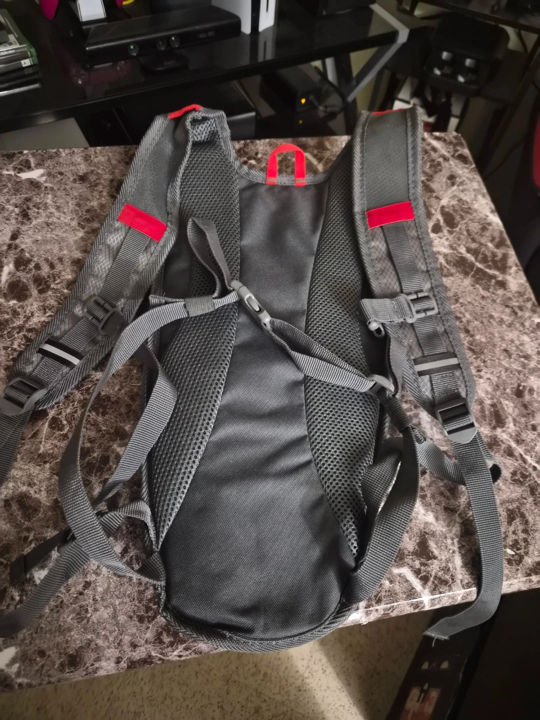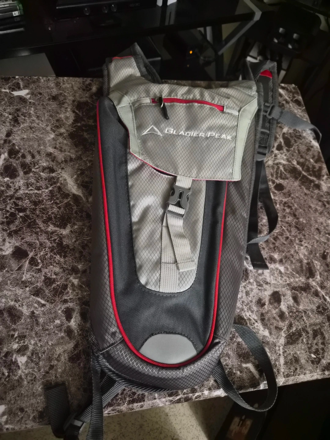 This Glacier Peak hydration backpack comes with a water bladder and tube. It's designed for outdoor activities. Multiple straps offer an adjustable, comfortable fit. Has never been used.