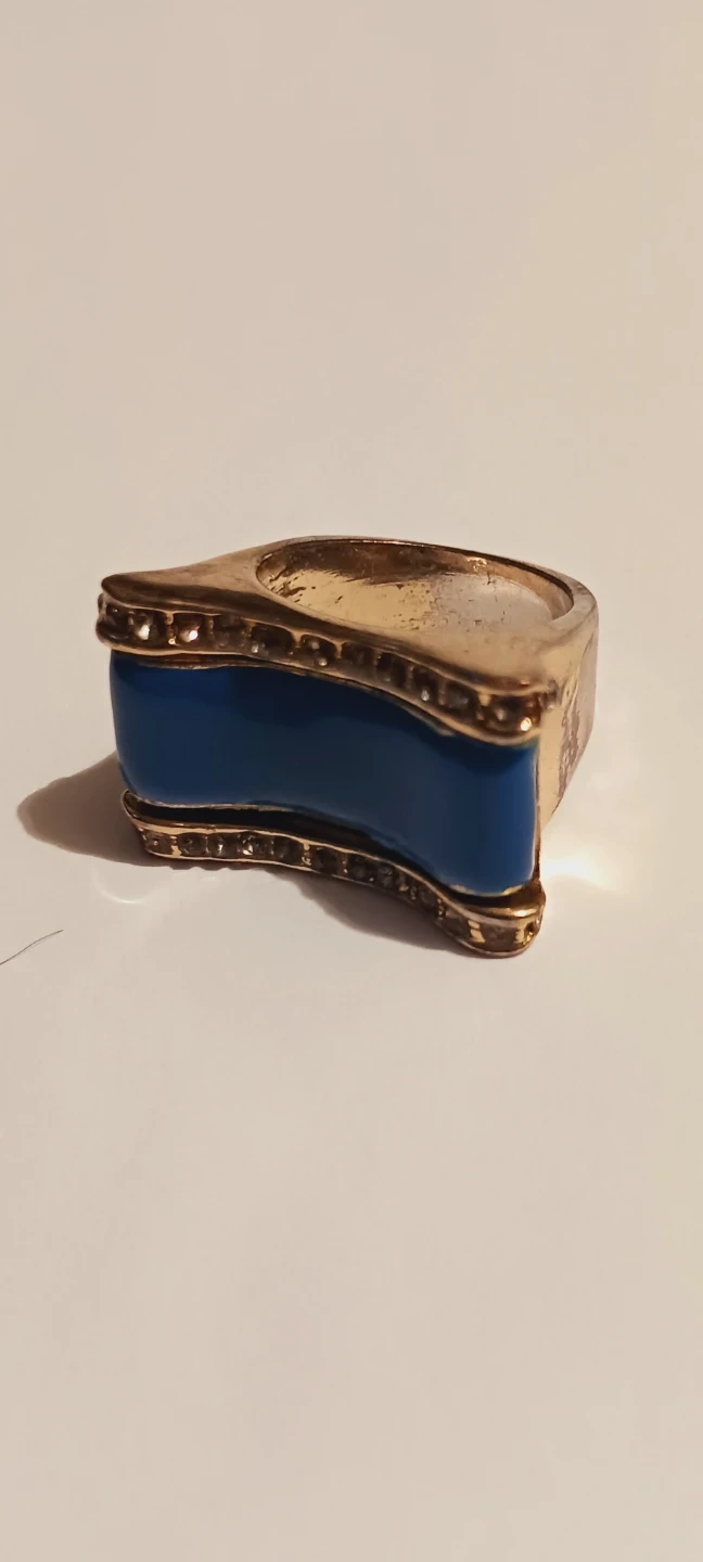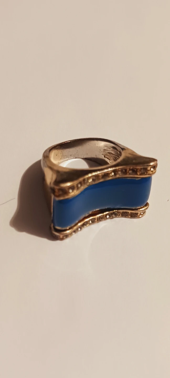 This ring features a gold-tone metal band with a striking blue enamel inlay. It has a unique, modern design that stands out. Perfect for adding a pop of color to any outfit! Size 6.