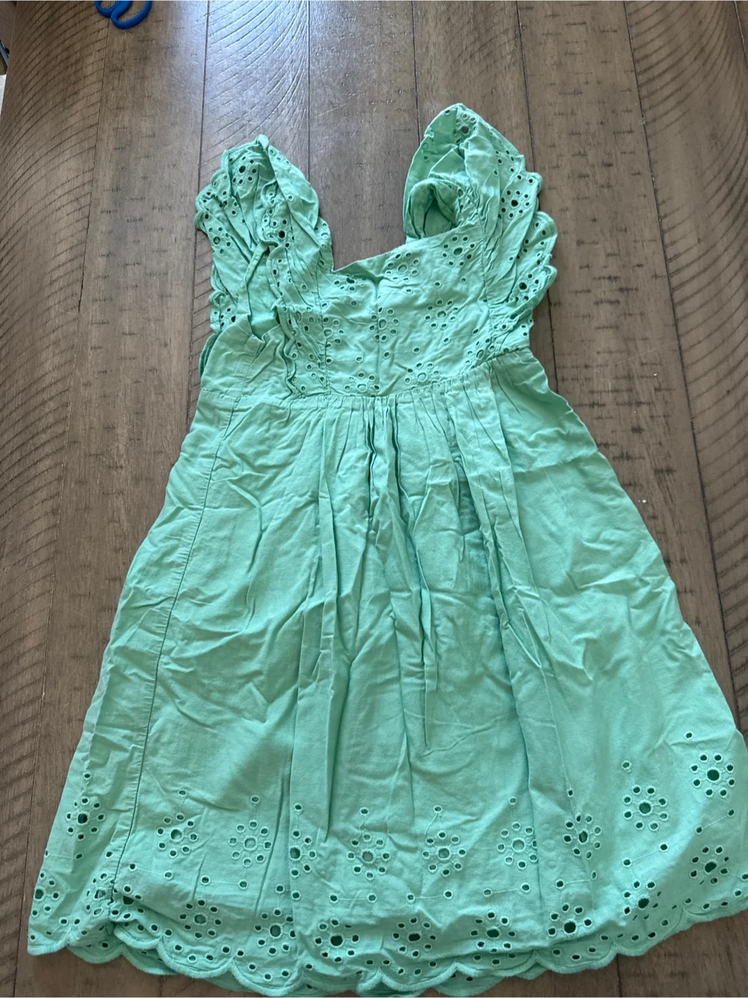 Sweet mint green dress with delicate eyelet detailing. Features flutter sleeves and a gathered waist. Lightweight fabric perfect for warm weather!