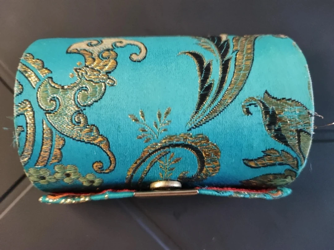 This is a cute little lipstick case with a teal floral pattern. It has a mirror inside, perfect for quick touch-ups on the go! The case is in good condition and ready for a new lipstick.