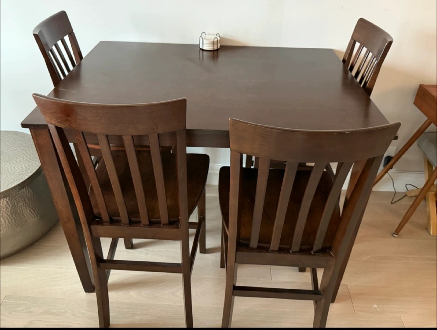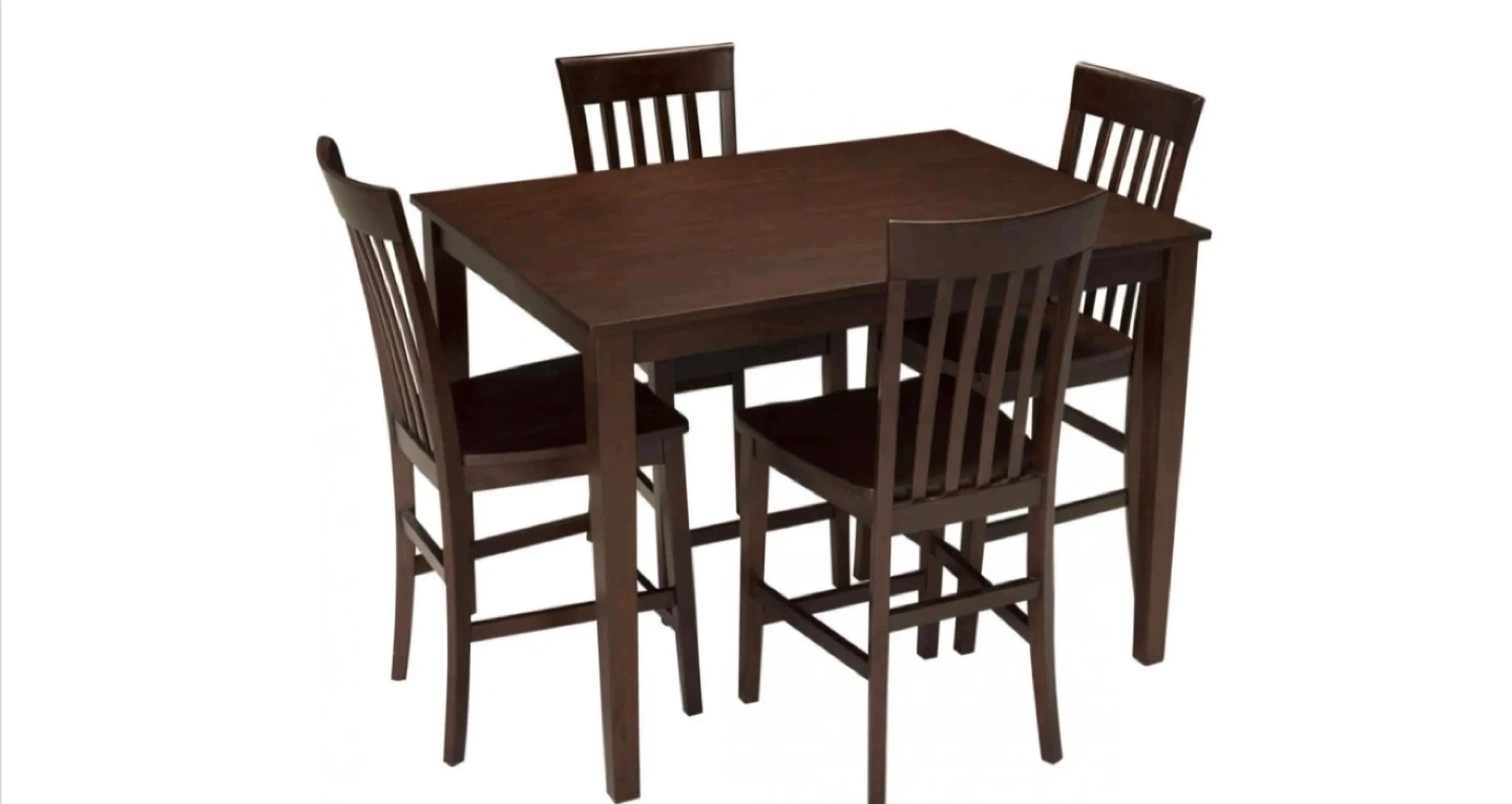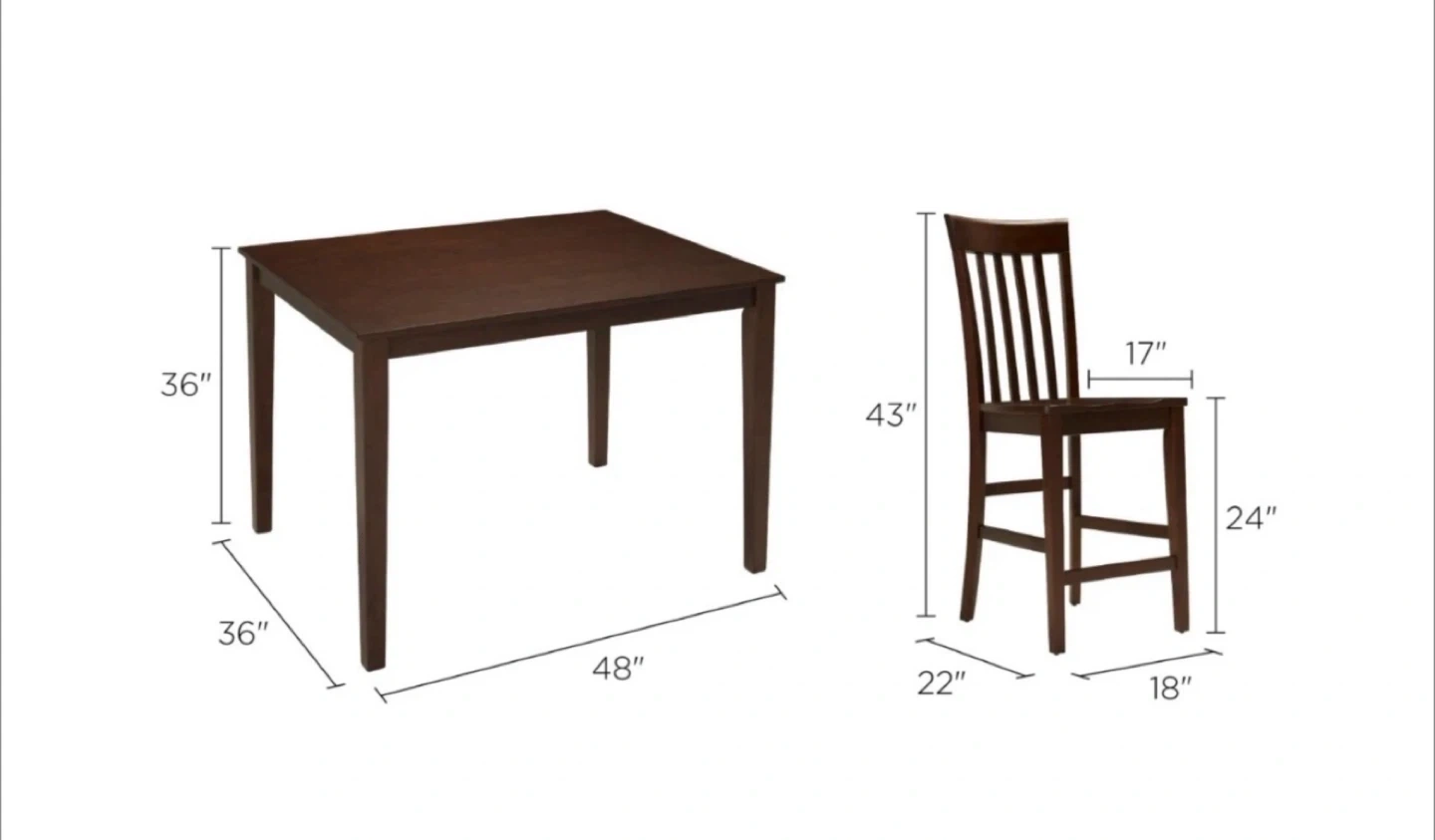 This is a 7-piece dining set featuring one table and four chairs. The table measures 48" long, 36" wide, and 36" high. Each chair is 22" wide, 18" deep, and 43" high with a 24" seat height. This set's dark wood finish fits many decors.