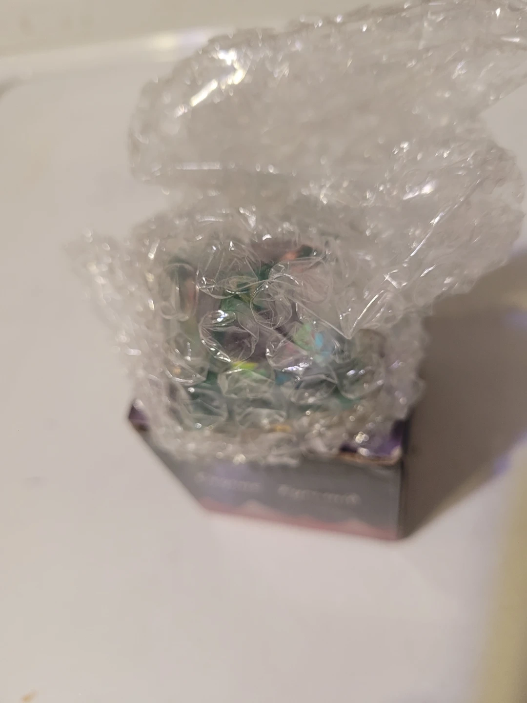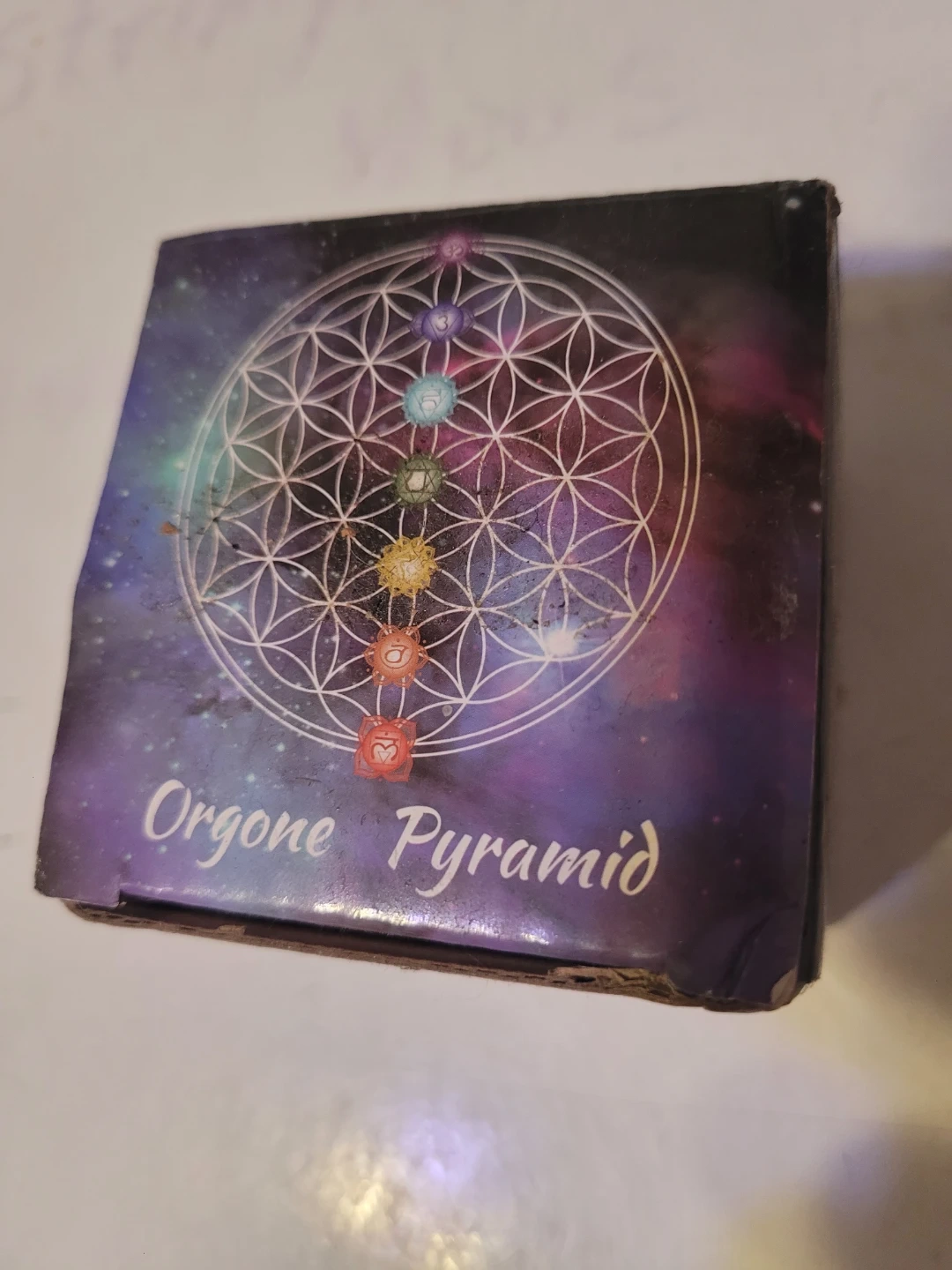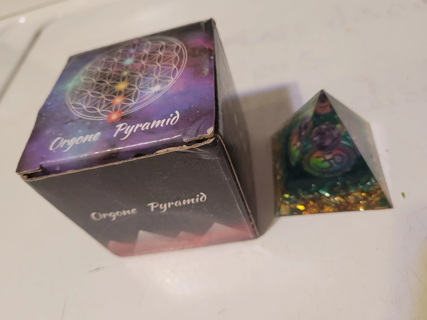 This orgone pyramid features a colorful OM symbol and embedded gemstones. It comes with its original box. It's an orgone energy pyramid.