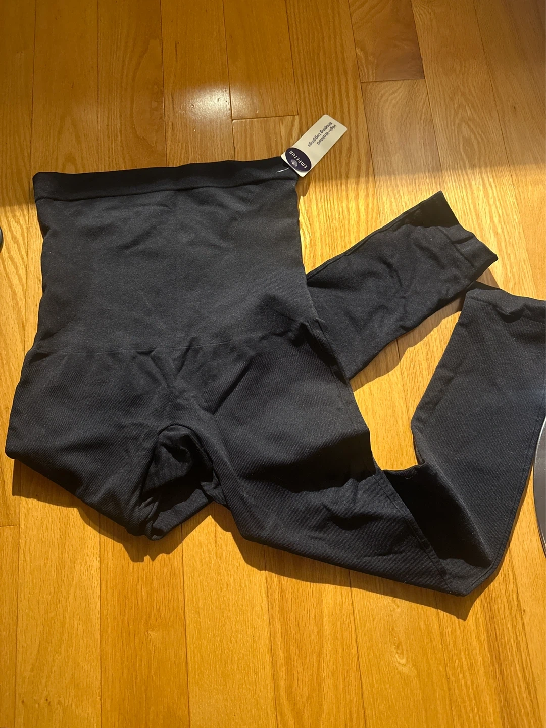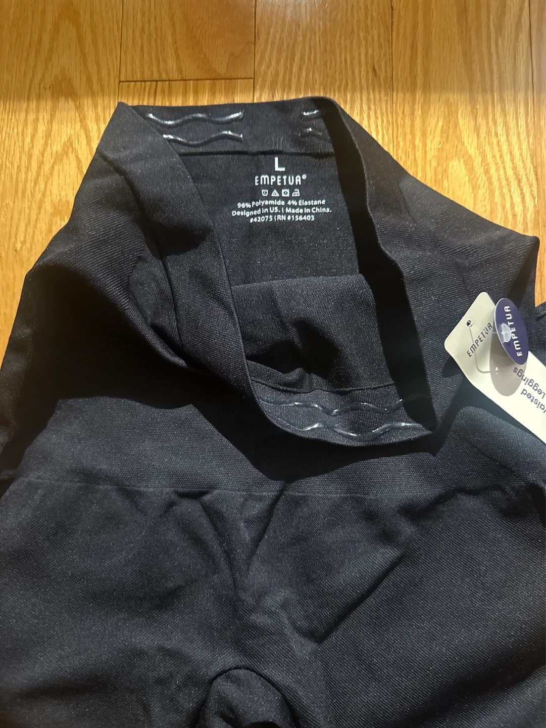 Empetua high-waisted leggings in black. Size L, very high stretch with maximum compression. Better than skims in my opinion! Made with 96% polyamide and 4% elastane. Designed in USA, made in China. These leggings offer a comfortable and supportive fit.