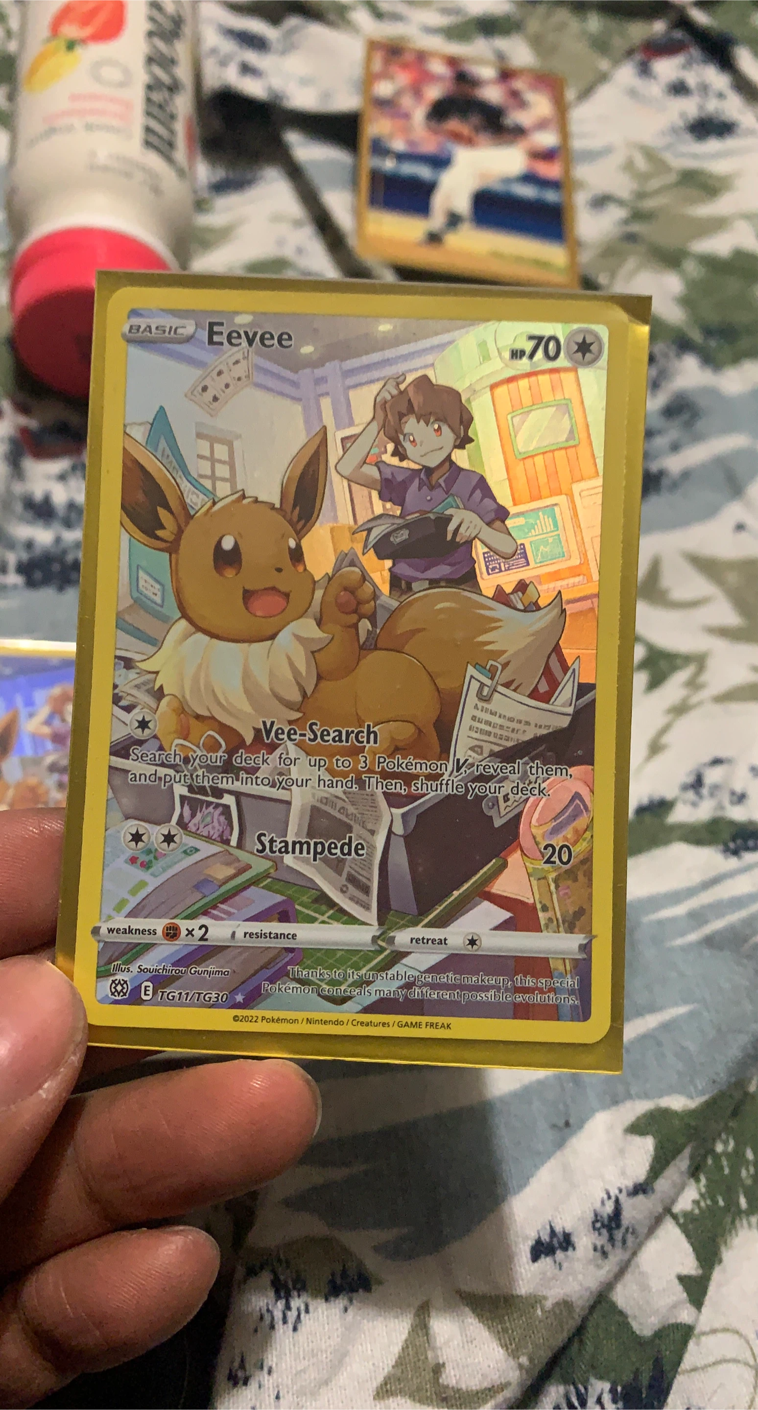 Selling an Eevee Pokemon card! It has the Vee-Search and Stampede moves. The card is from 2022. have two 9-/10 condioton