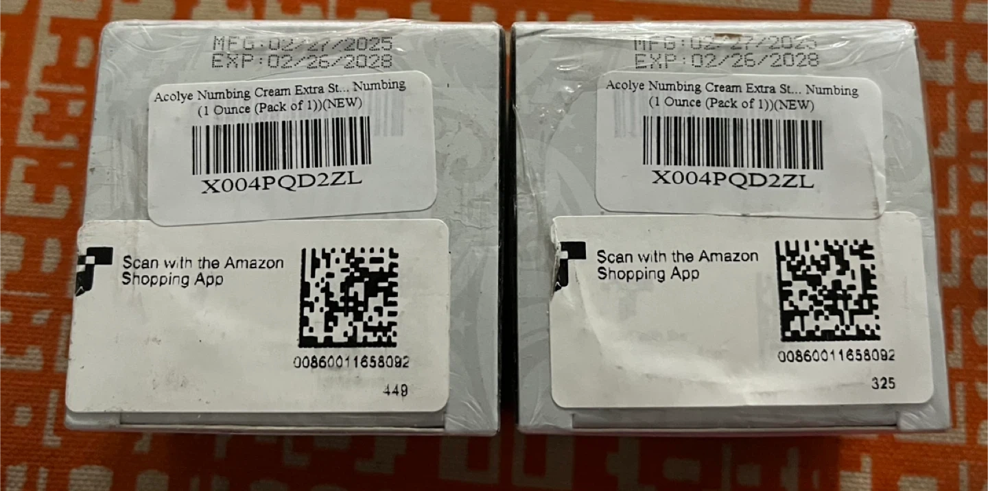 This is a 2-pack of Acolye Tattoo Numbing Cream. It's extra strength for long-lasting numbness. Net wt is 50ML (1.7OZ) per unit. MFG date is 02/27/2025, EXP date is 02/26/2028.