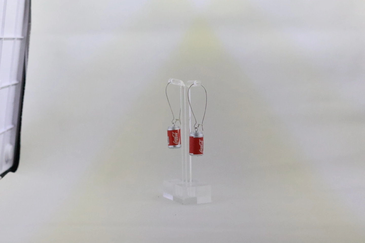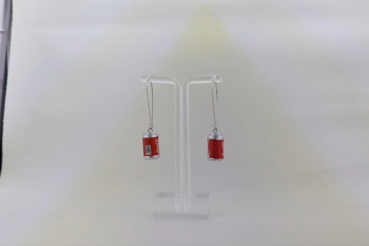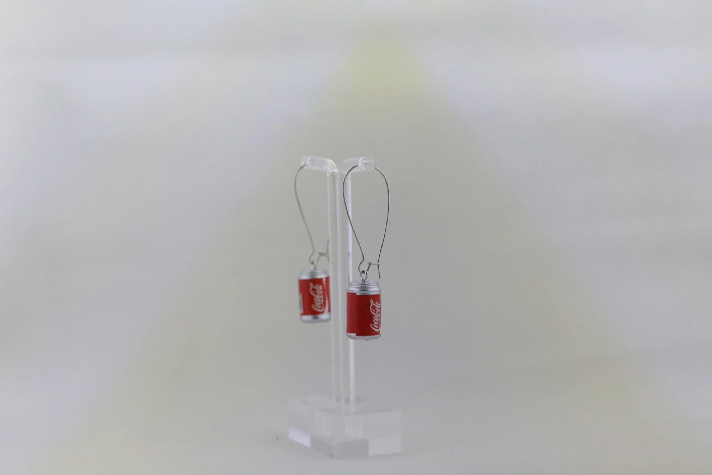 Pair of dangle earrings. Features miniature coke cans design. Iron hooks. Lightweight and fun.
