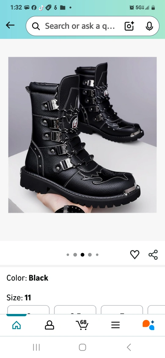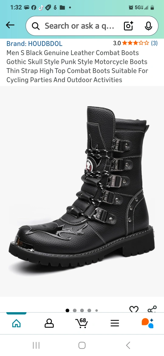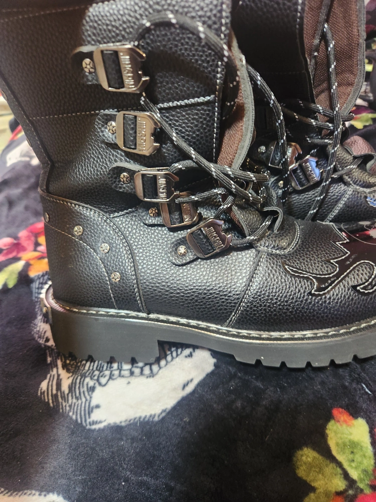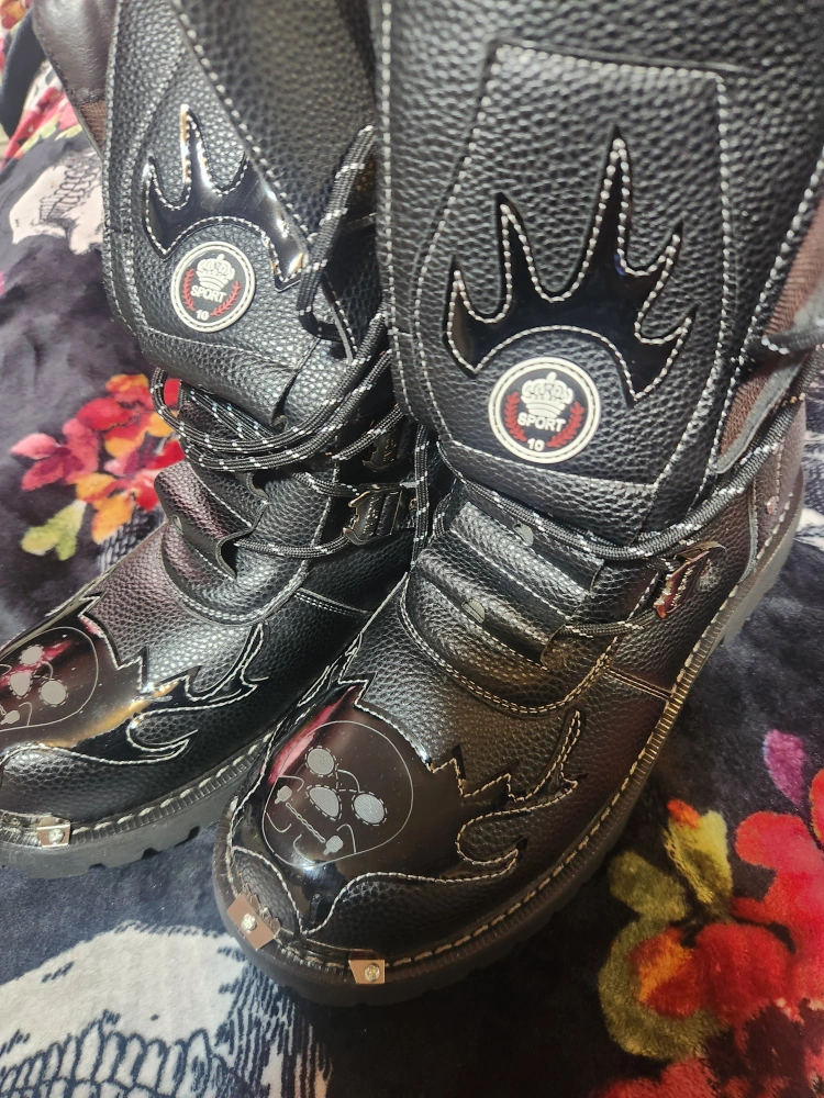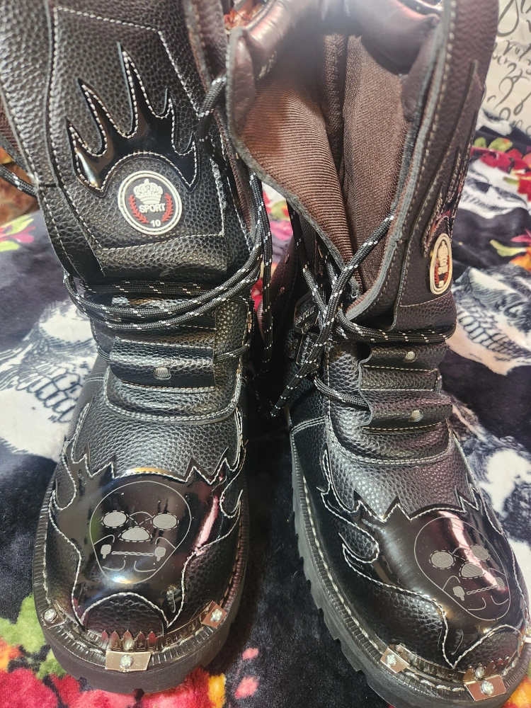 These HOUDBDOL boots feature a black genuine leather construction with punk-inspired skull and flame detailing. They have a high-top combat style with multiple buckles and laces for a secure fit. Excellent for motorcycle rides or outdoor activities!
