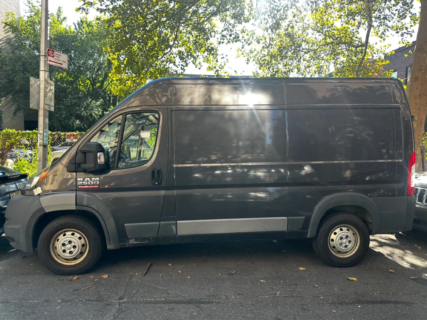 Dark gray cargo van. Ram ProMaster 2500 model. Reliable for hauling goods or as a work vehicle. Spacious interior for all your needs!
