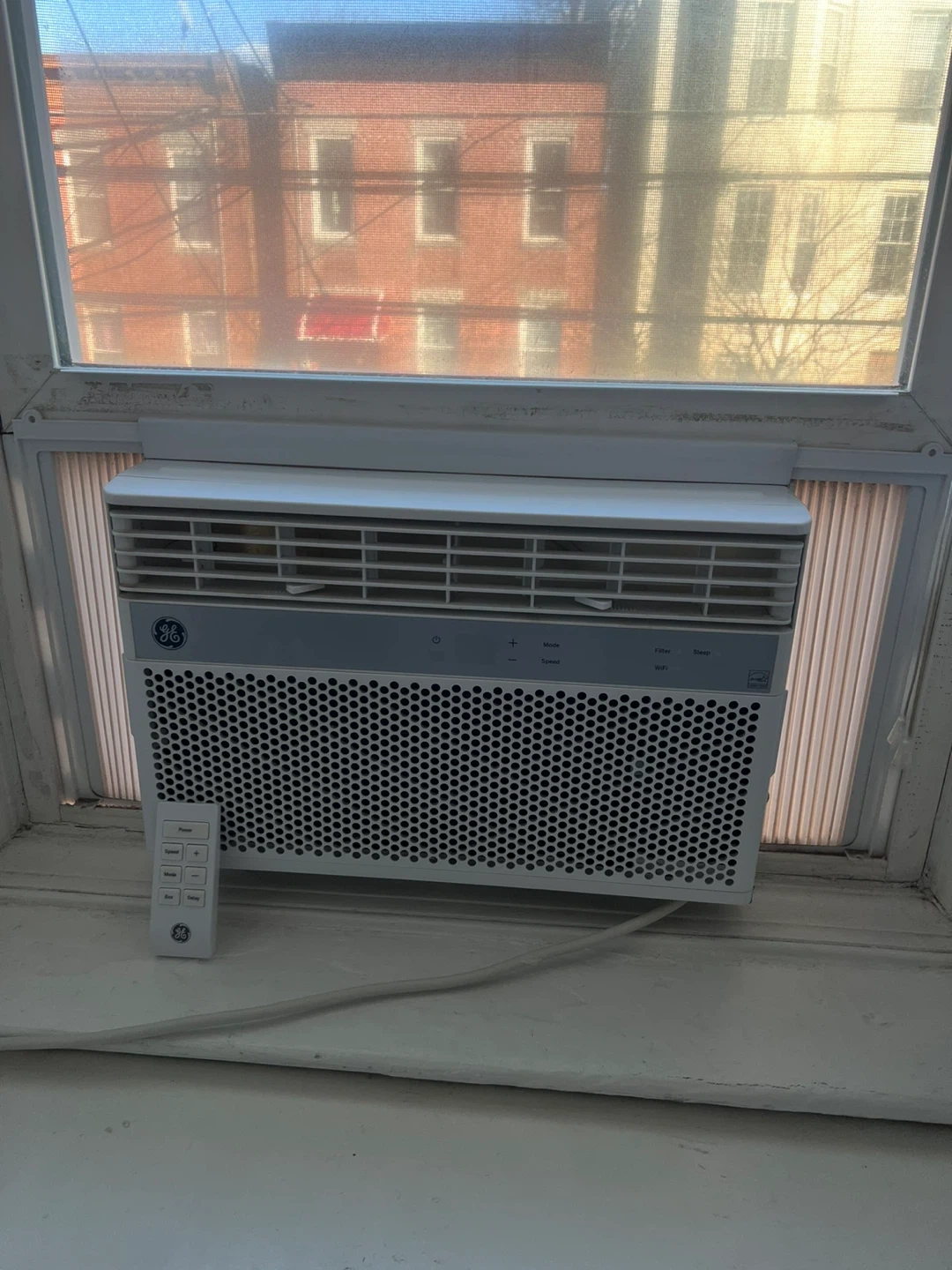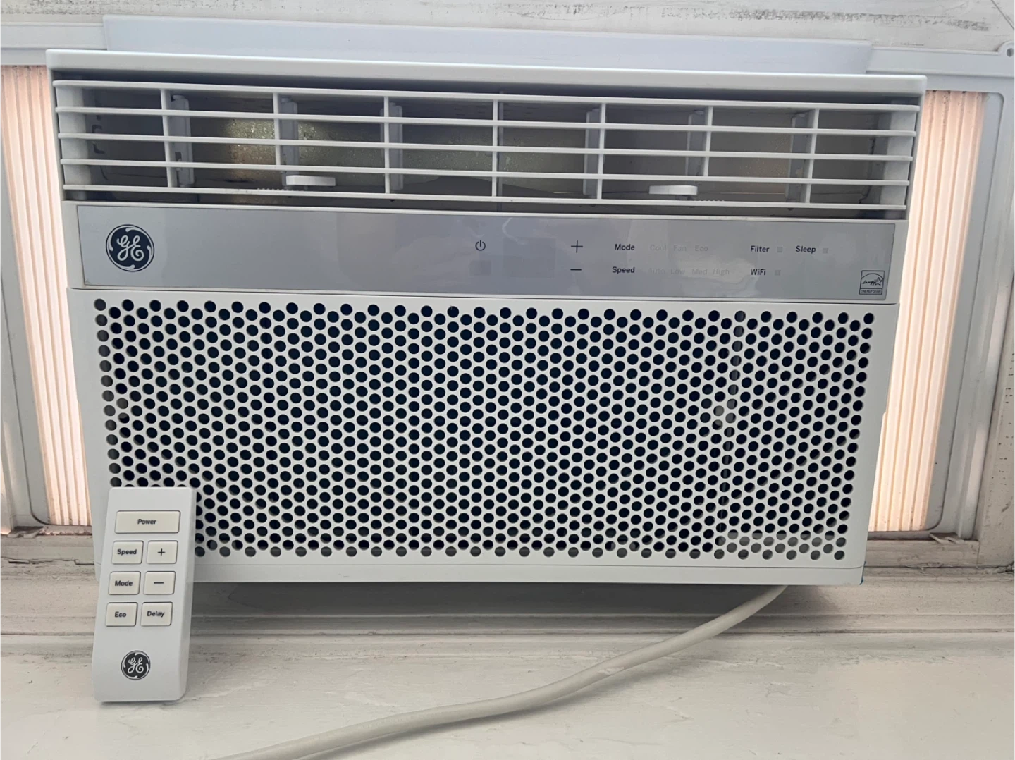 This is a GE window air conditioner 8000 BTU. It includes the original remote control. Unit has multiple modes like Mode, Speed, Eco, Filter, and Sleep. Great for keeping a room cool!