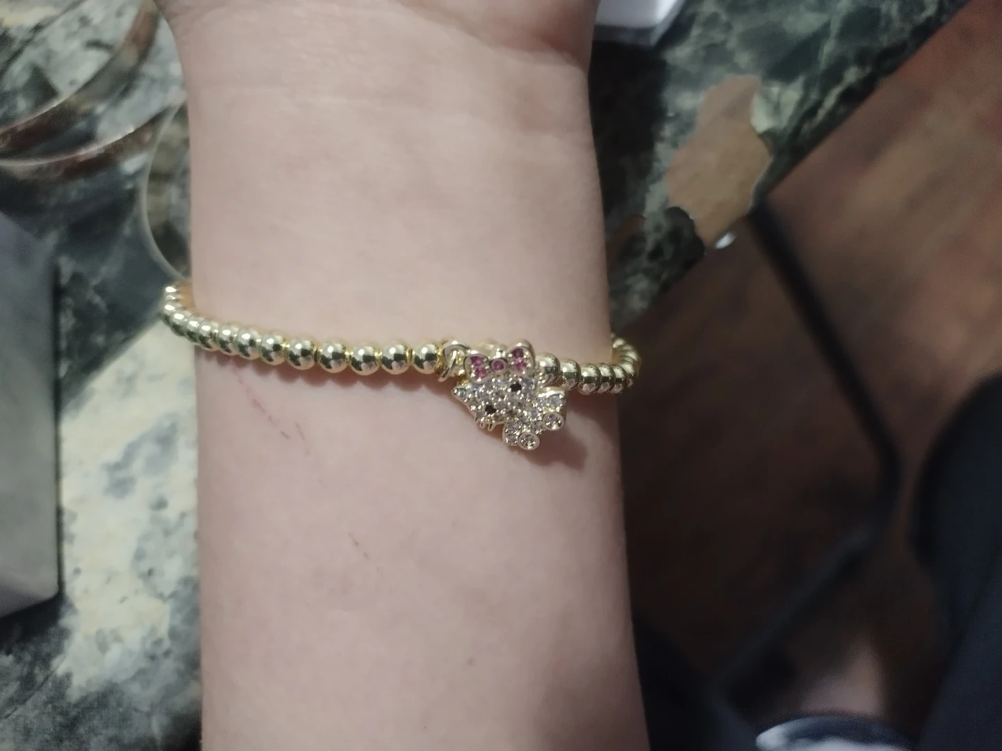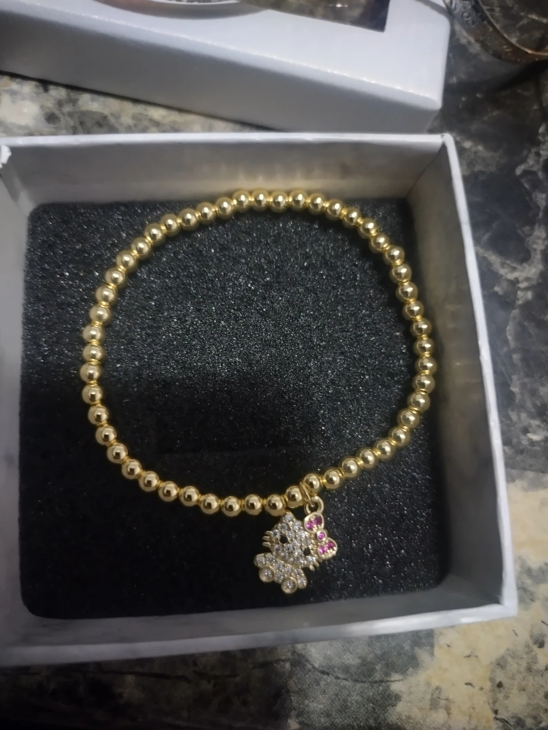 This stretchy beaded bracelet features a sparkly Hello Kitty charm with pink and clear rhinestones ,The bracelet's gold tone beads are strung on elastic for an easy fit. It comes in a decorative gift box!