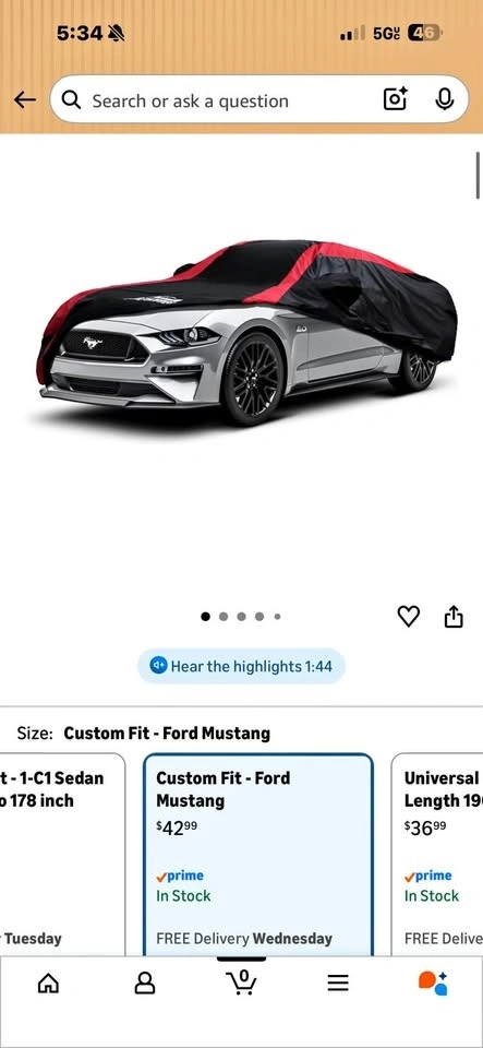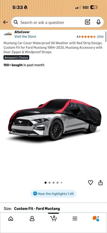 Waterproof all-weather car cover with a red strip design. Custom fit for Ford Mustang 1994-2025. Features a door zipper and windproof straps.