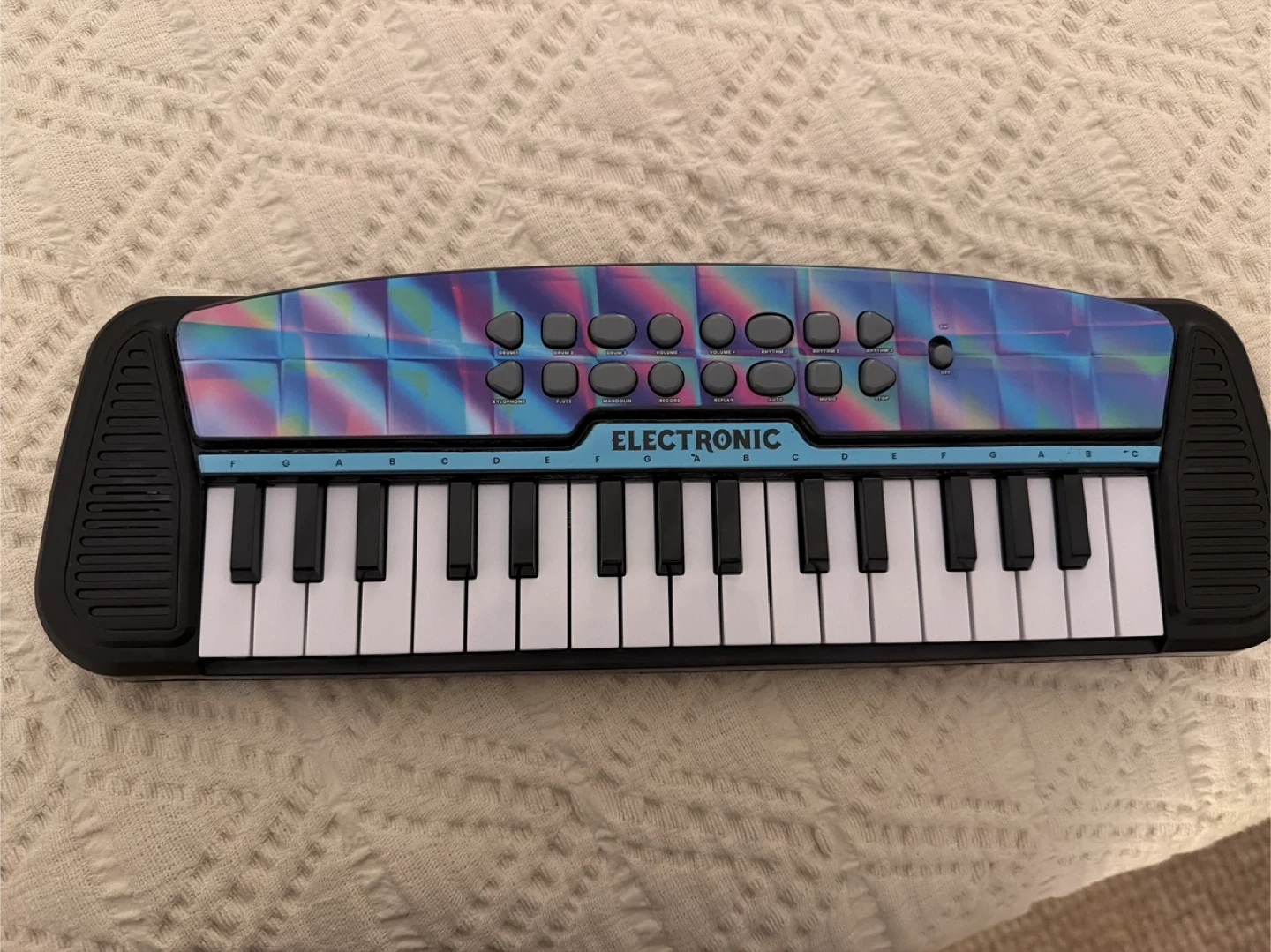 This electronic keyboard features a vibrant, iridescent design and multiple buttons for different sounds and rhythms. It includes keys labeled with notes A through G. Great for kids!