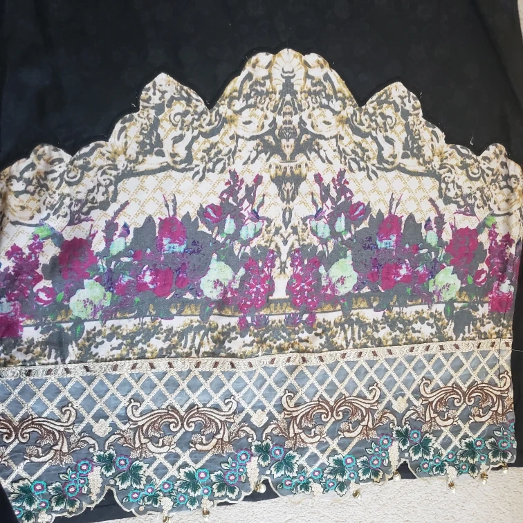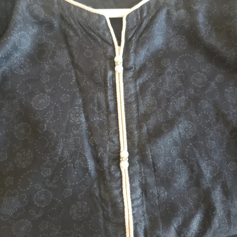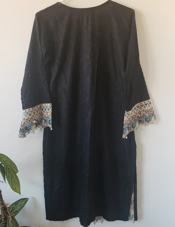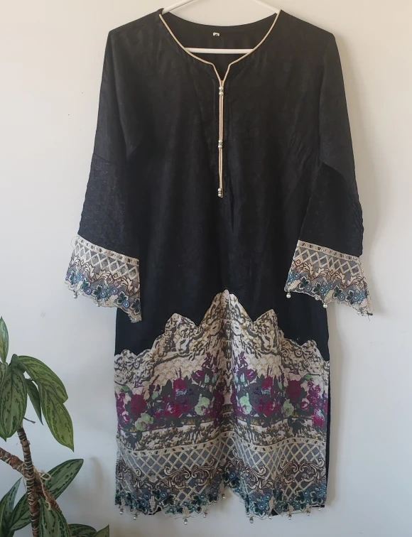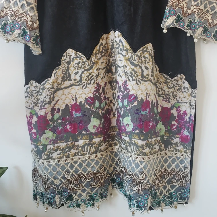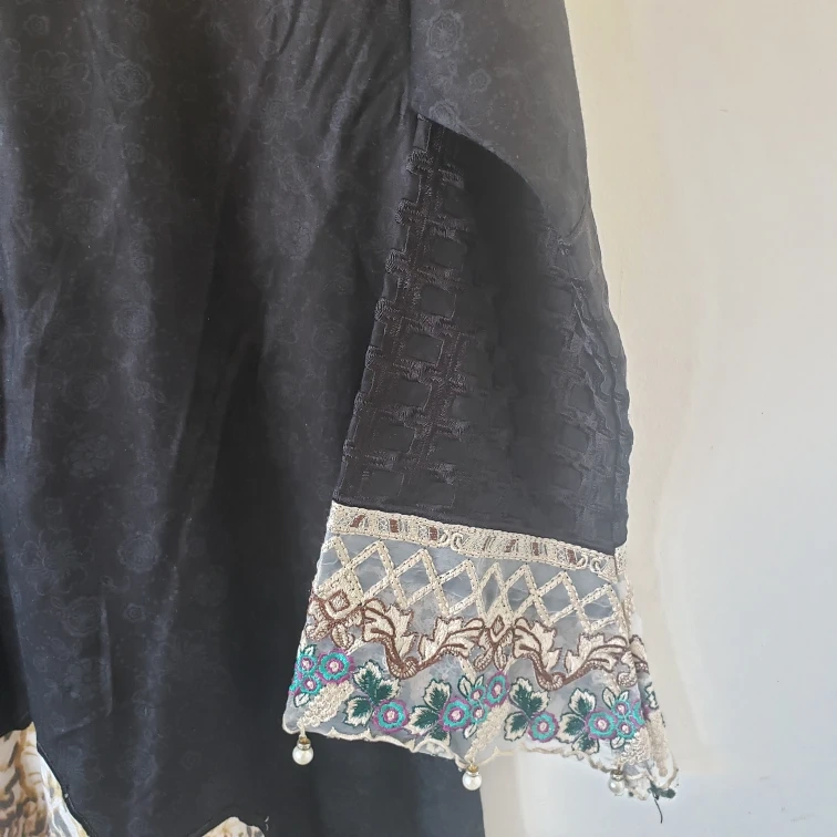 Black kurta with embroidered detailing, floral print and pearls on the sleeves and bottom. Three-quarter sleeves