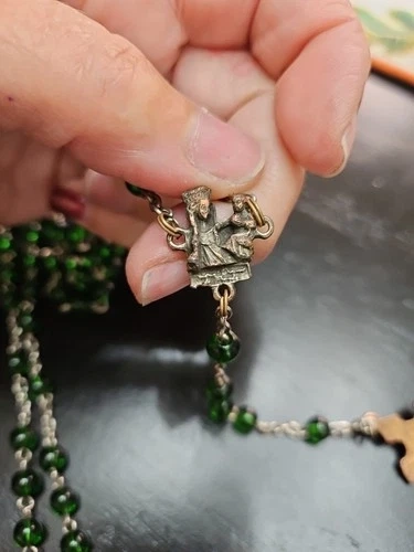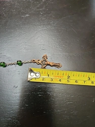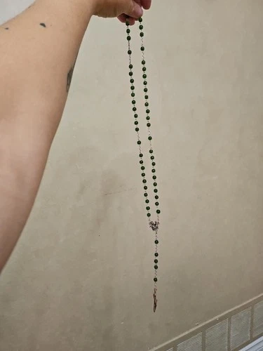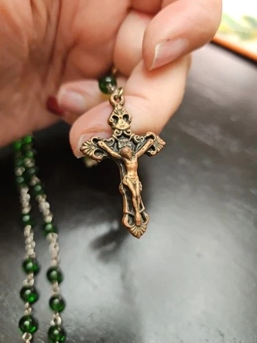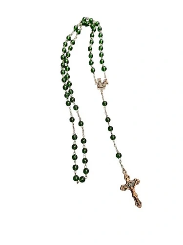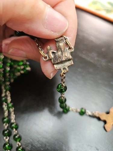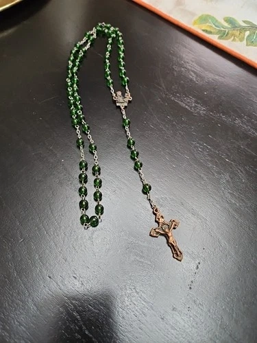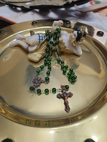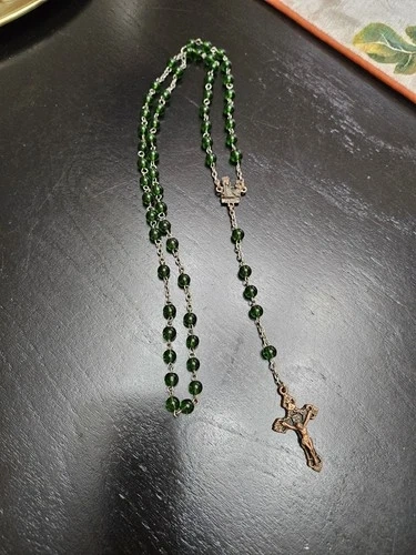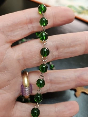 Discover a piece of spiritual beauty with this Vintage Green Beaded Glass Rosary. Crafted in Italy, it's a testament to fine Italian artisanship. The glass beads exude a serene green hue, offering a calming visual complement to your devotional practices. This rosary is a meaningful addition for anyone who cherishes religious artifacts or seeks a symbolic treasure. It's a prayer bead set that embodies the teachings of Christianity, honoring the Virgin Mary and the sacred life of Jesus. A delicate and timeless collectible, it holds the weight of faith and the elegance of Italian artistry.