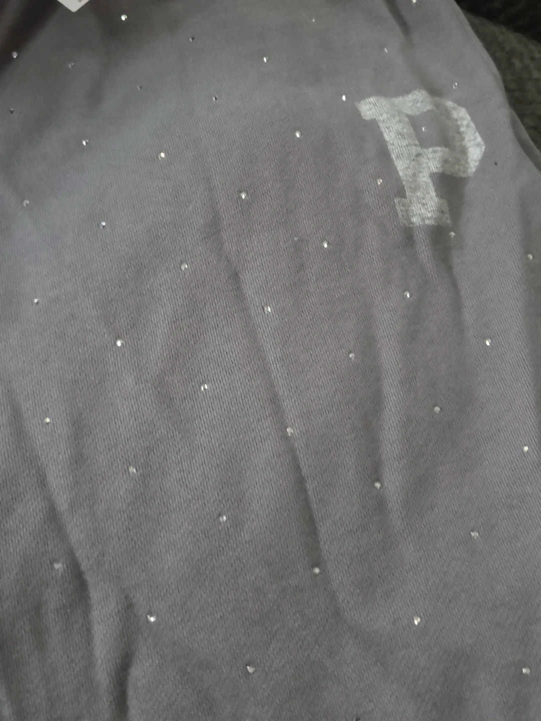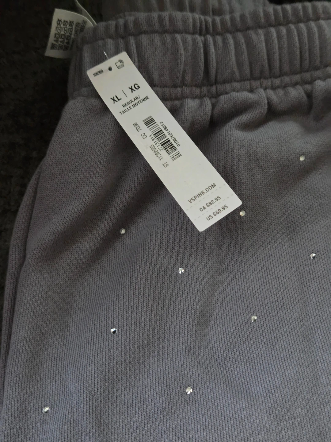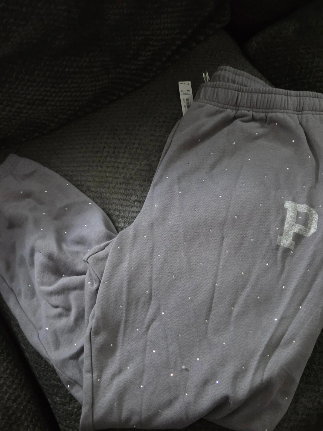 These are PINK Victoria's Secret jogger sweatpants in grey. They're a size XL and have all-over rhinestone embellishments. The pants also feature a large 'P' logo on the leg. New with tag