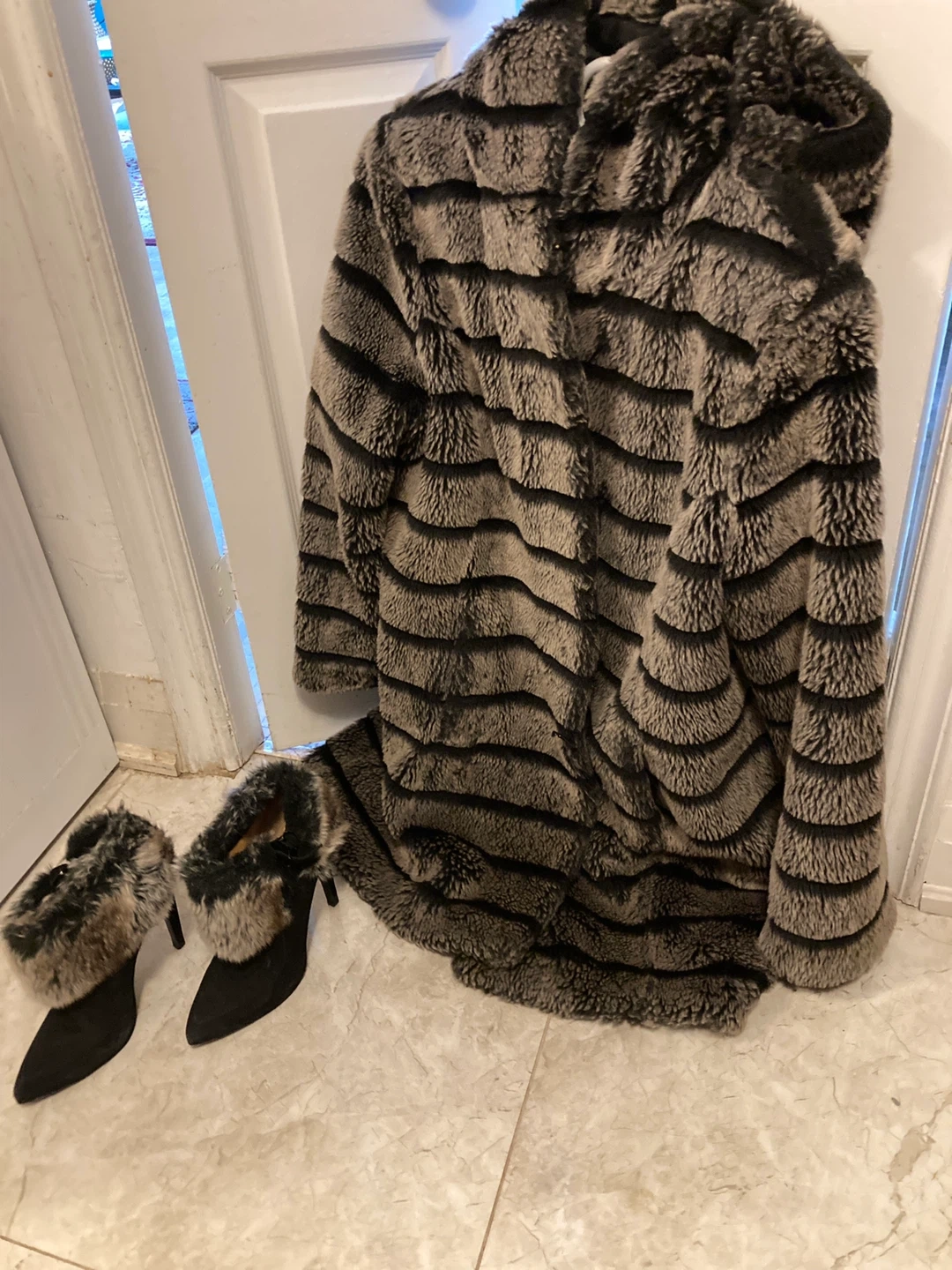 Women black and grey stripes coat and Stylish black ankle shoes featuring a pointed toe and faux fur trim. These boots have a stiletto heel and a side buckle detail for adjustment. They're made from faux suede material. Size 7