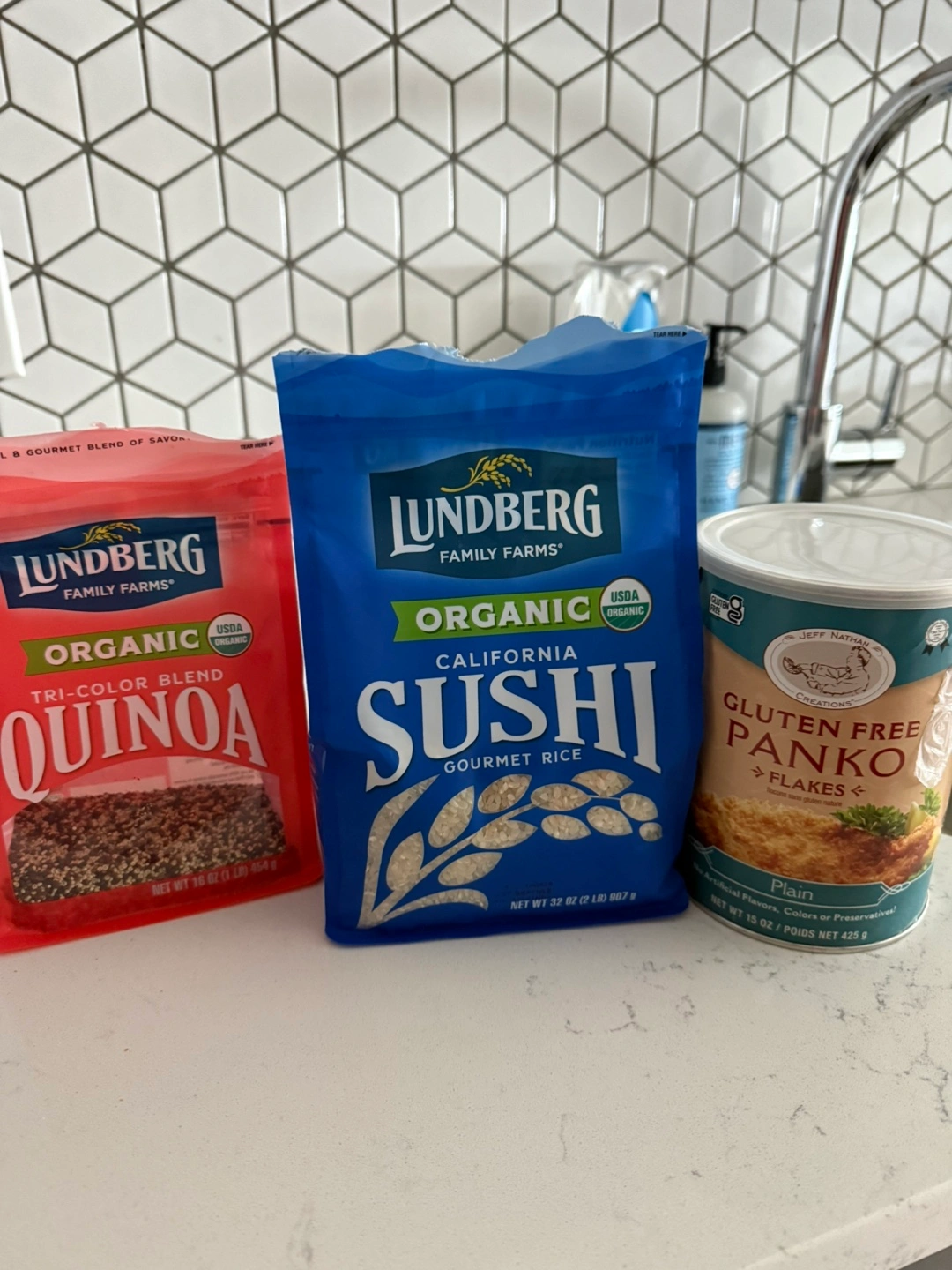 Items including quinoa, sushi rice, gluten free panko, hot chocolate, and coffee. It's the perfect assortment of ingredients to create a comforting meal.