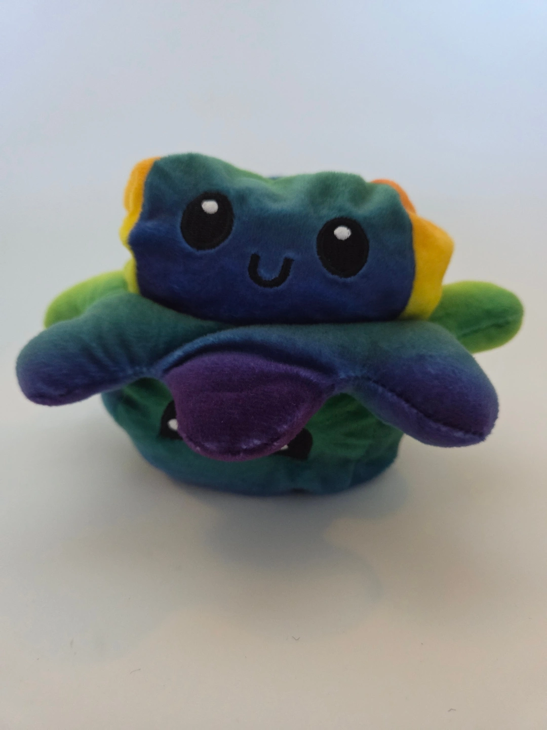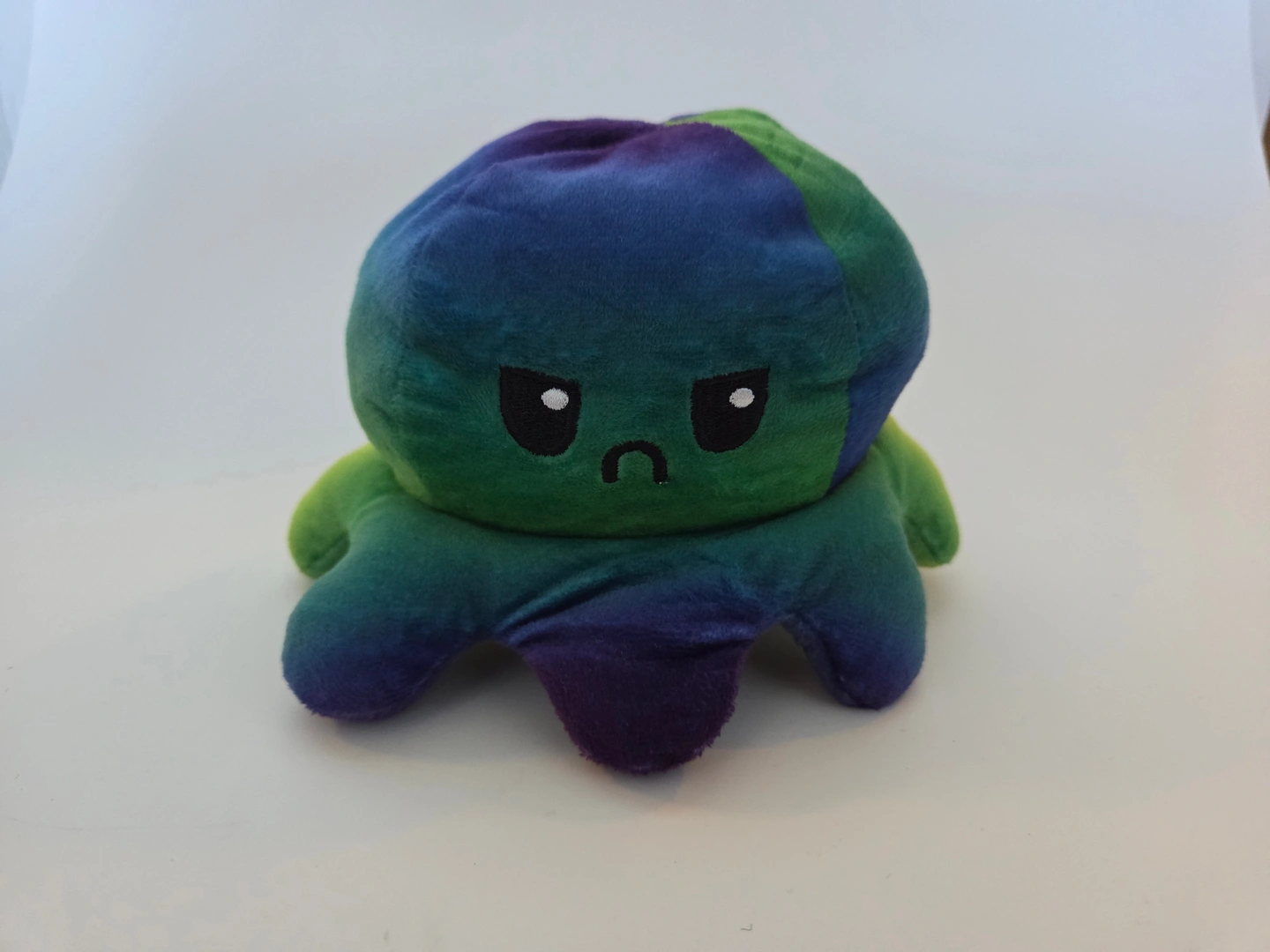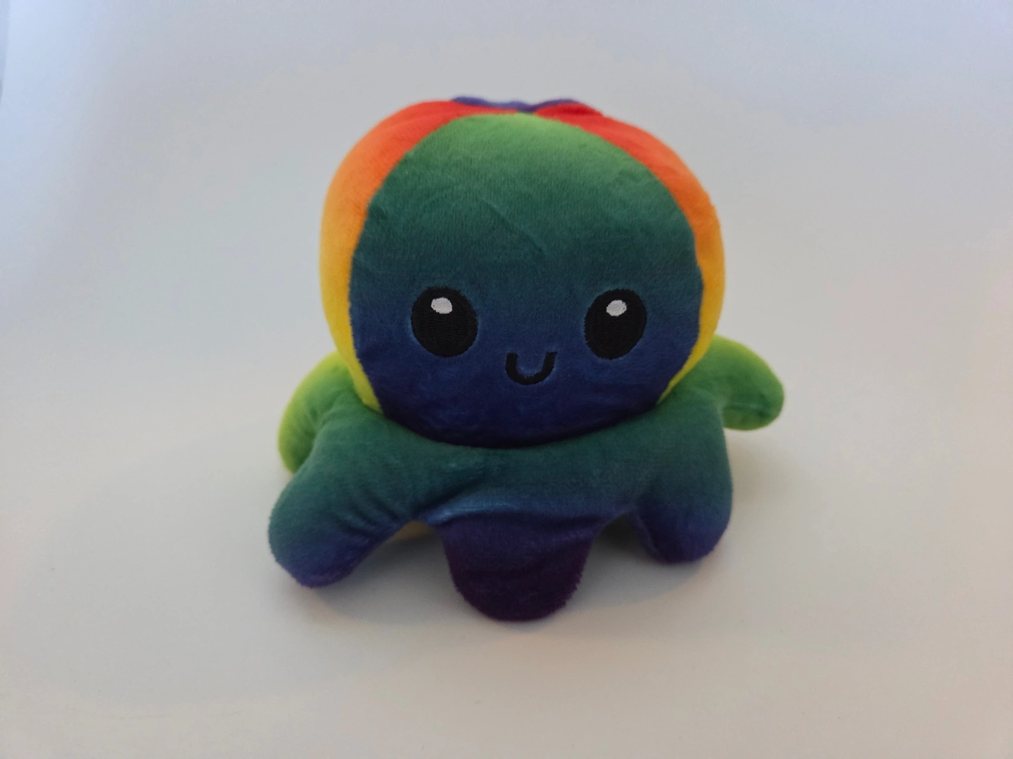 Cute reversible mood octopus plush in bright rainbow ombre. Flip it to switch from a happy face to a grumpy face – perfect for kids, desks, or as a fun stress toy.