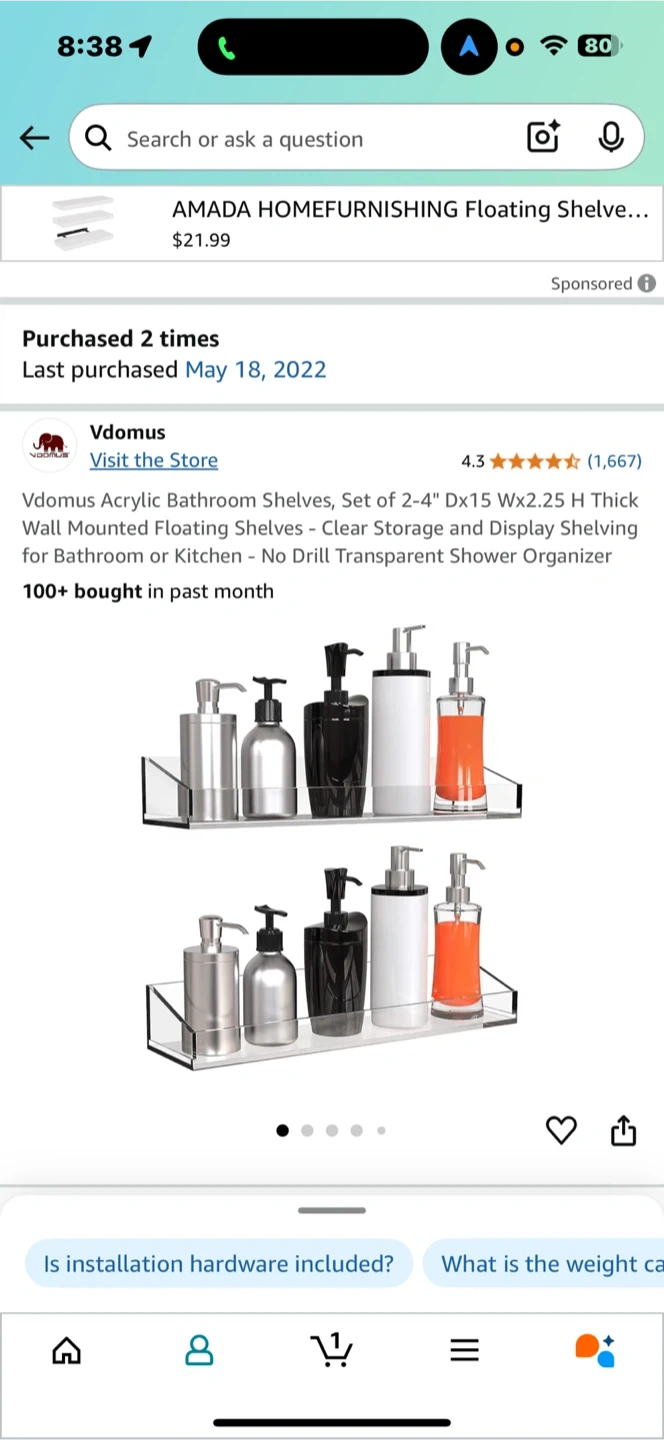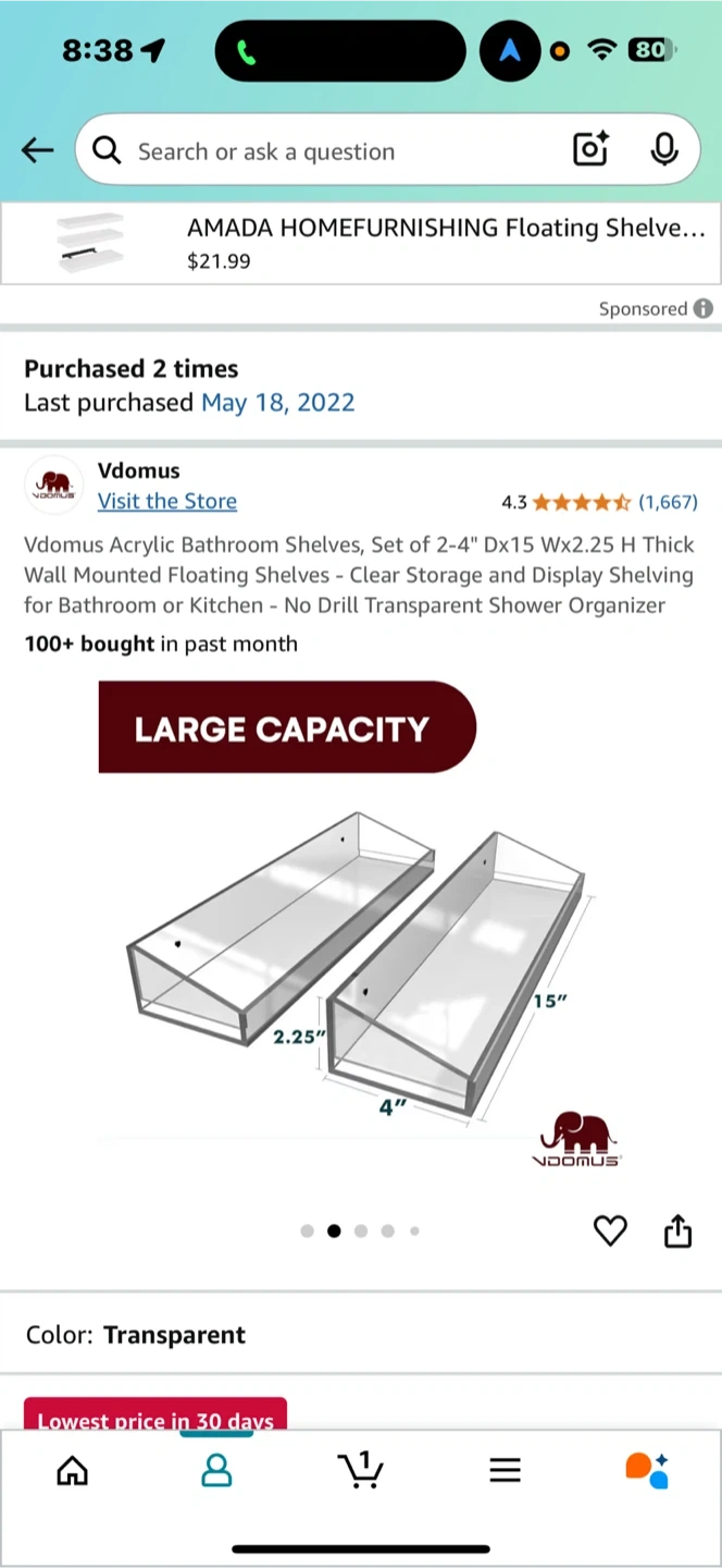 I'm selling a set of two Vdomus acrylic bathroom shelves. They're transparent and perfect for adding some extra storage to your bathroom or kitchen. Each shelf measures 4" D x 15" W x 2.25" H. These are great for displaying shelving for your bathroom or kitchen