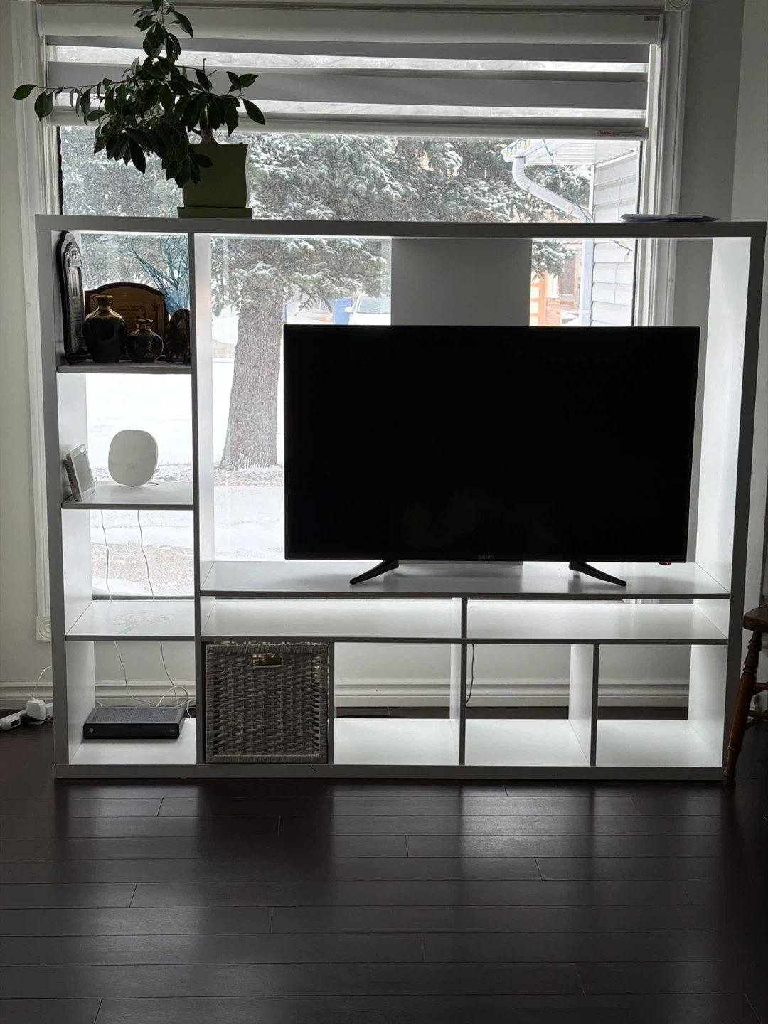 This is a spacious white entertainment unit, perfect for organizing your media. It features multiple shelving compartments and integrated LED lighting for a modern look. The unit is designed to hold a television and provide ample storage for electronics and decor.