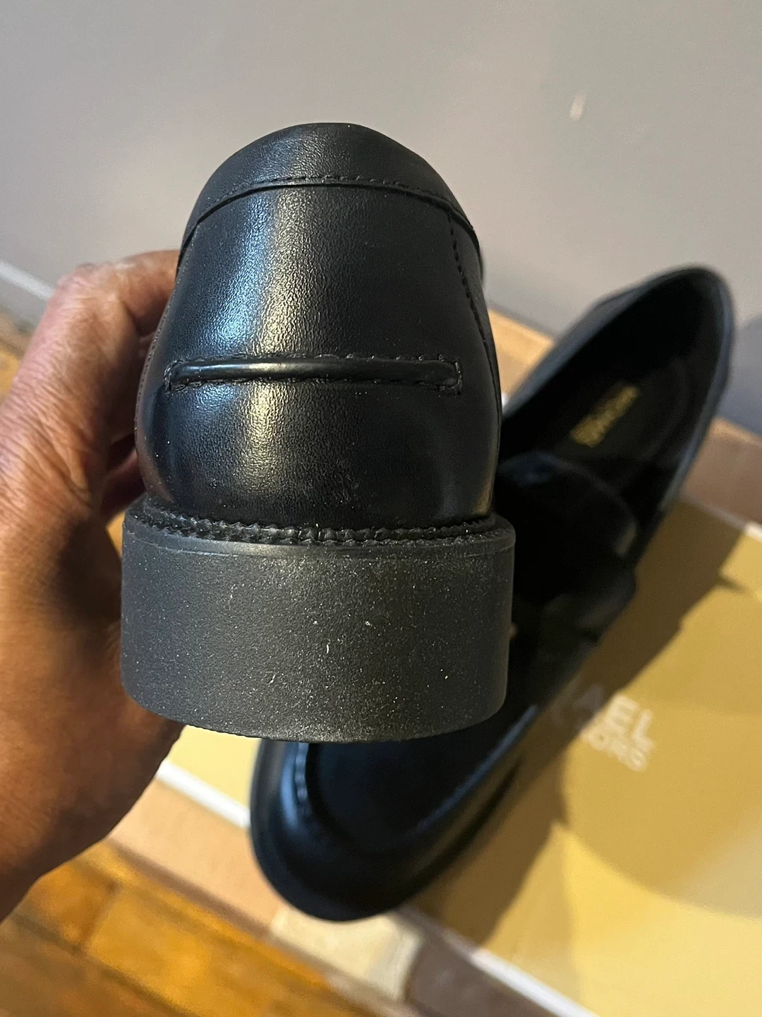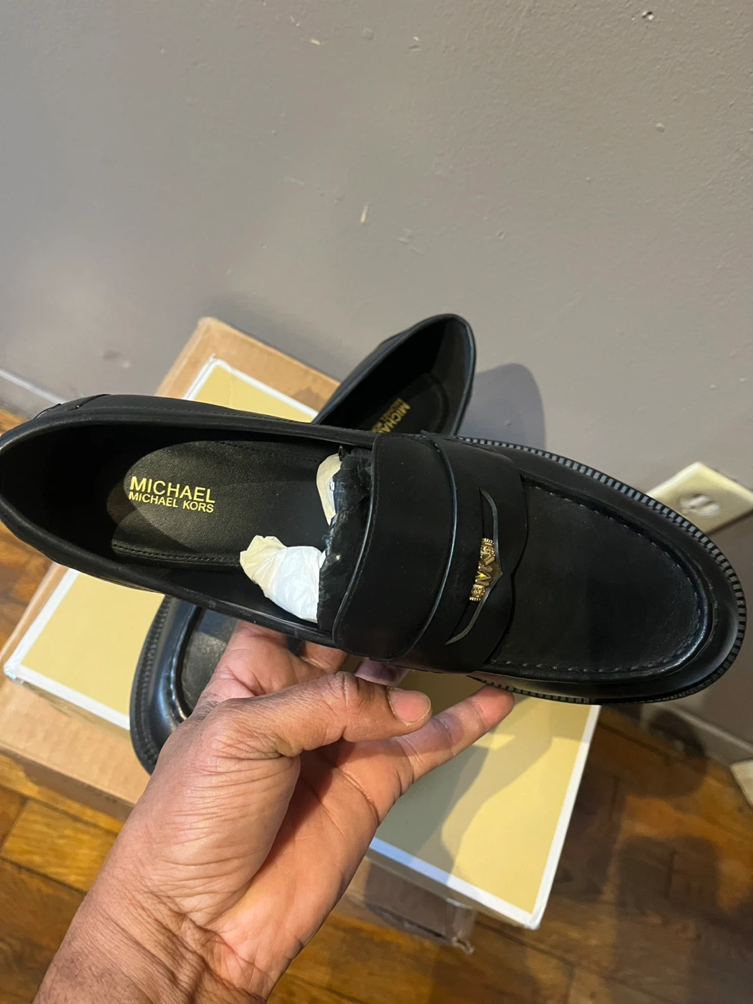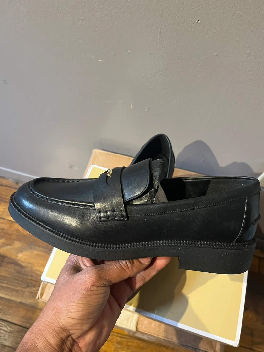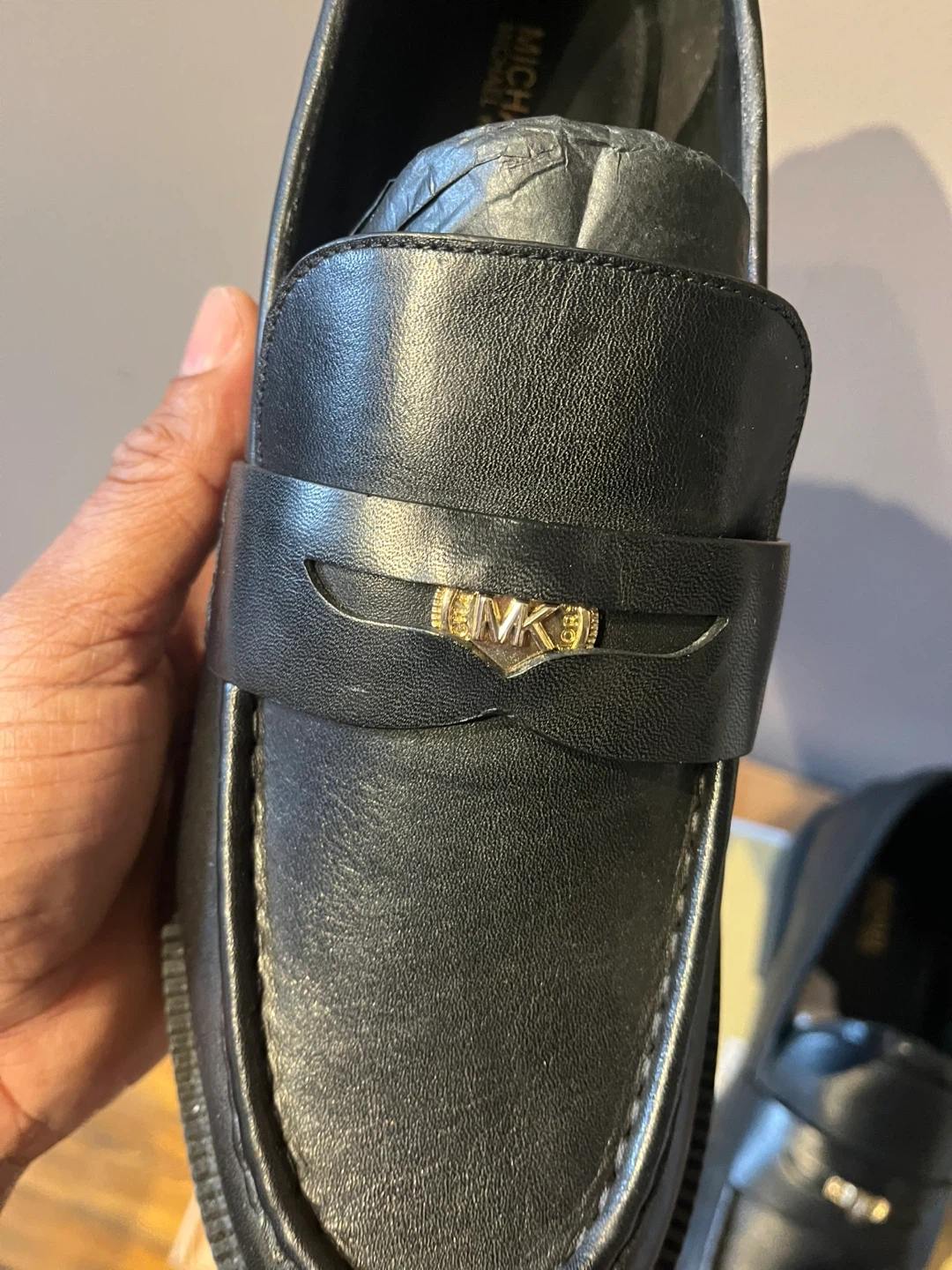 Stylish Michael Kors loafers in black leather. These classic penny loafers feature a comfortable slip-on design and durable soles. They're perfect for everyday wear or dressing up an outfit!