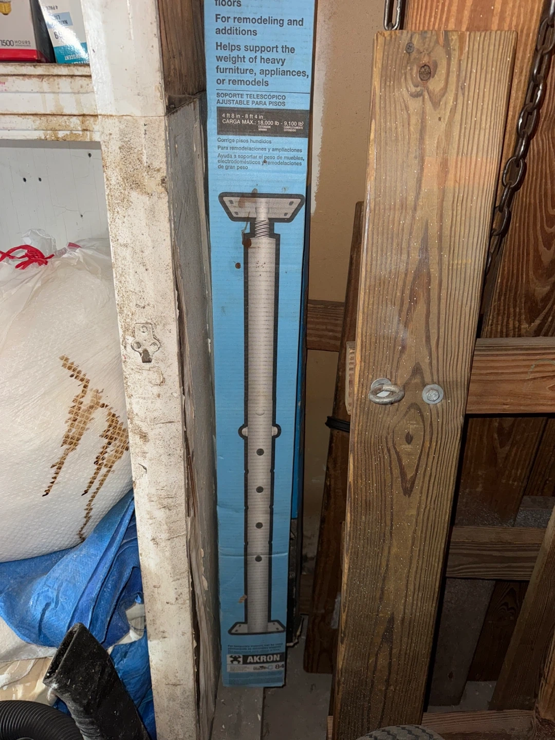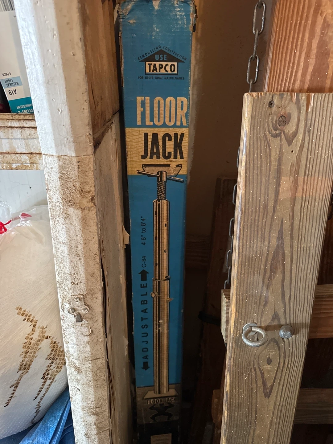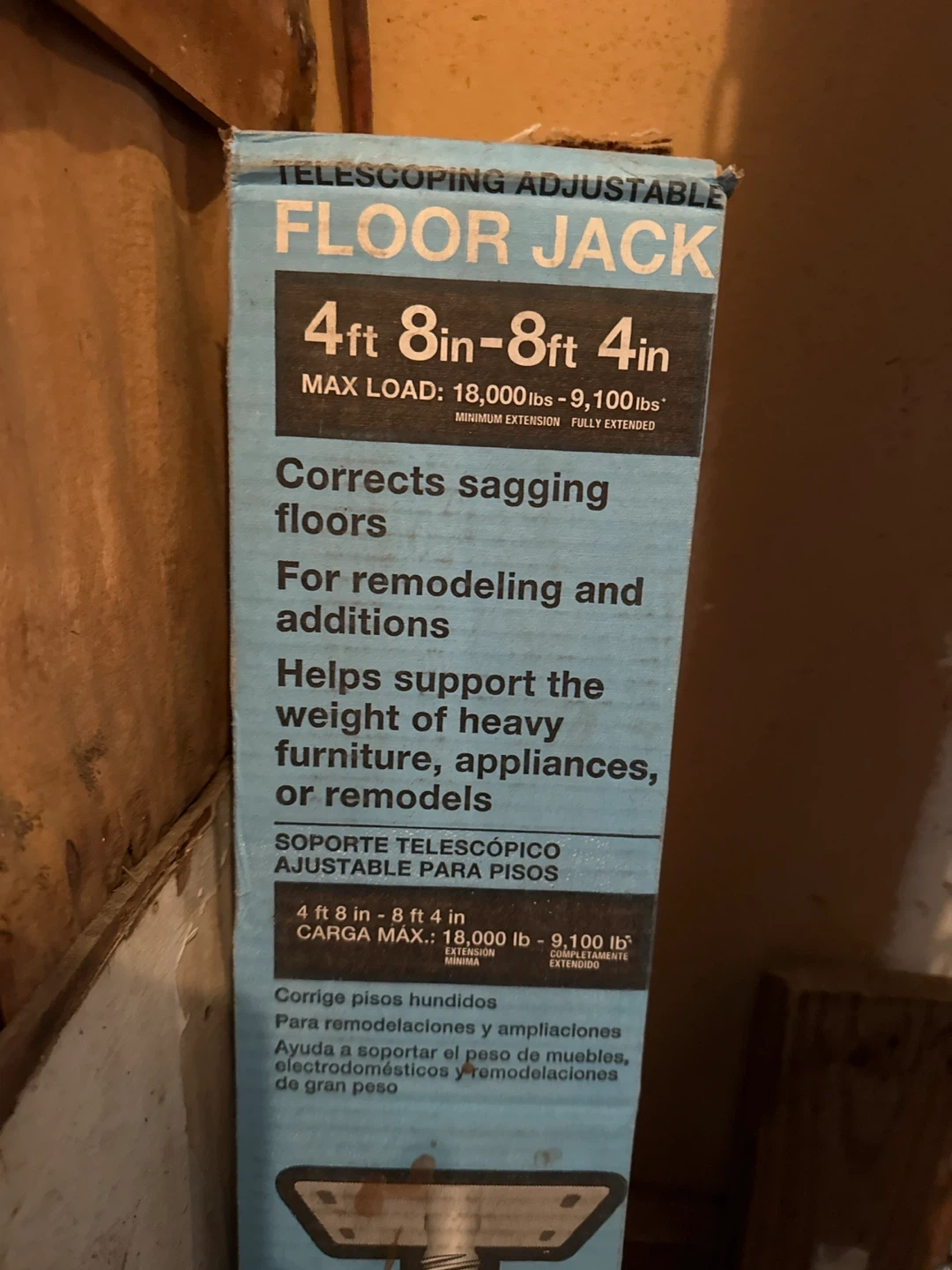 Selling a TAPCO adjustable floor jack. It's telescoping and adjustable, ranging from 4 ft 8 in to 8 ft 4 in. It's designed for remodeling and additions, and helps support the weight of heavy furniture, appliances, or remodels. The max load is 18,000 lbs at minimum extension and 9,100 lbs fully extended