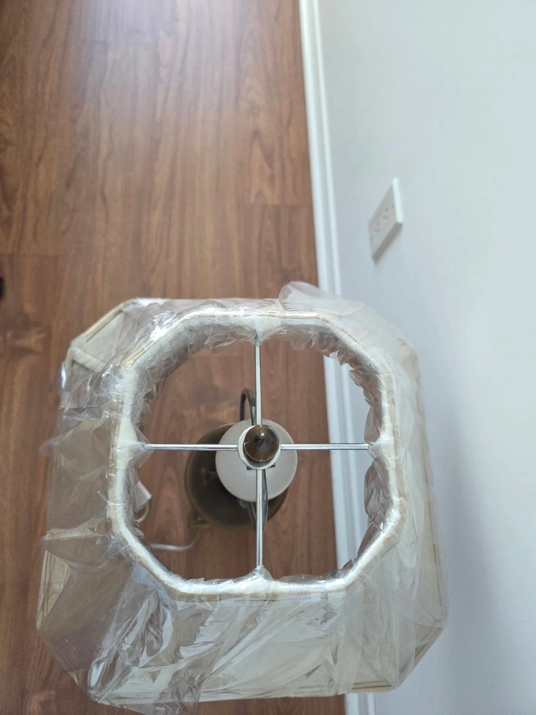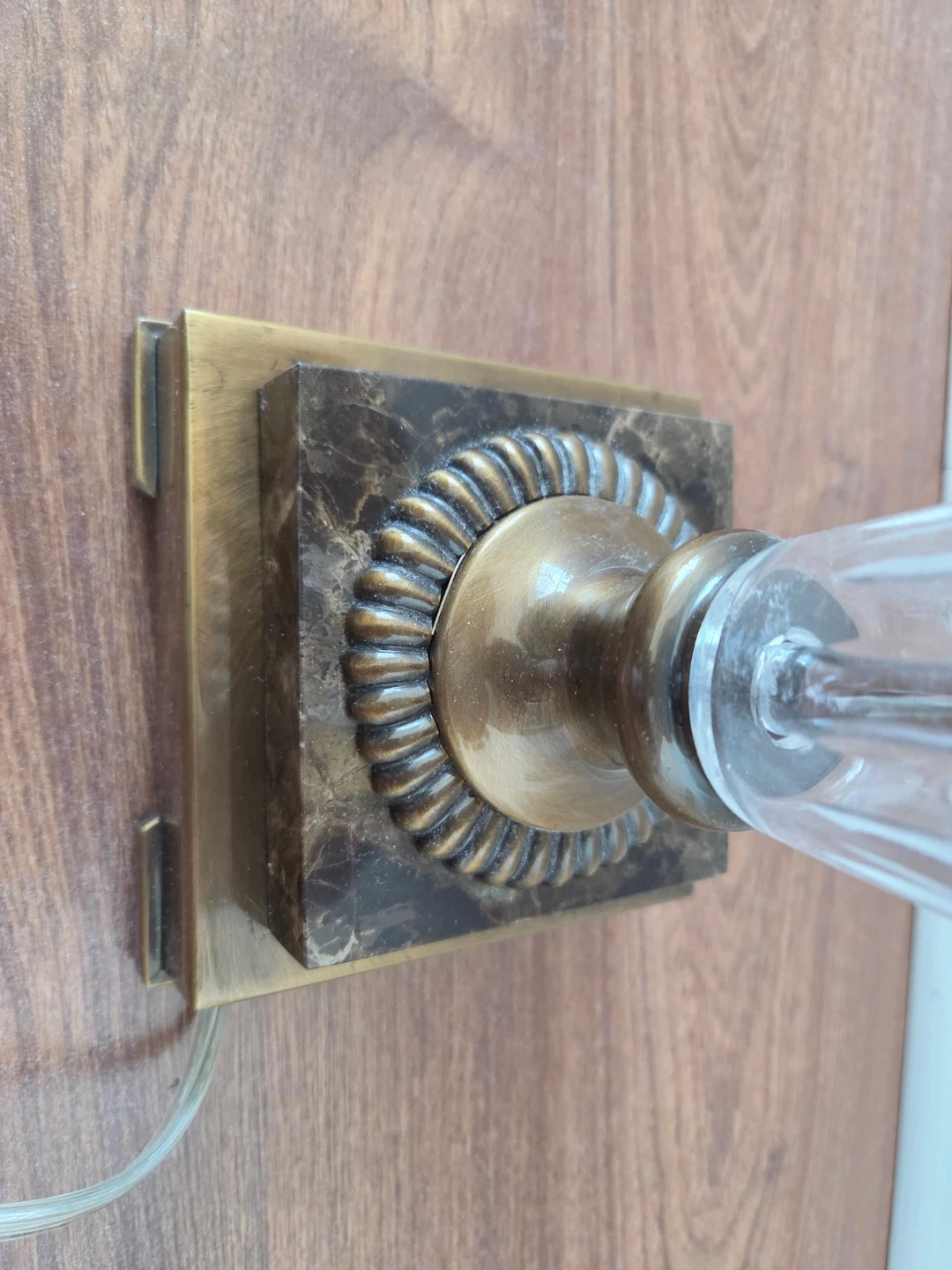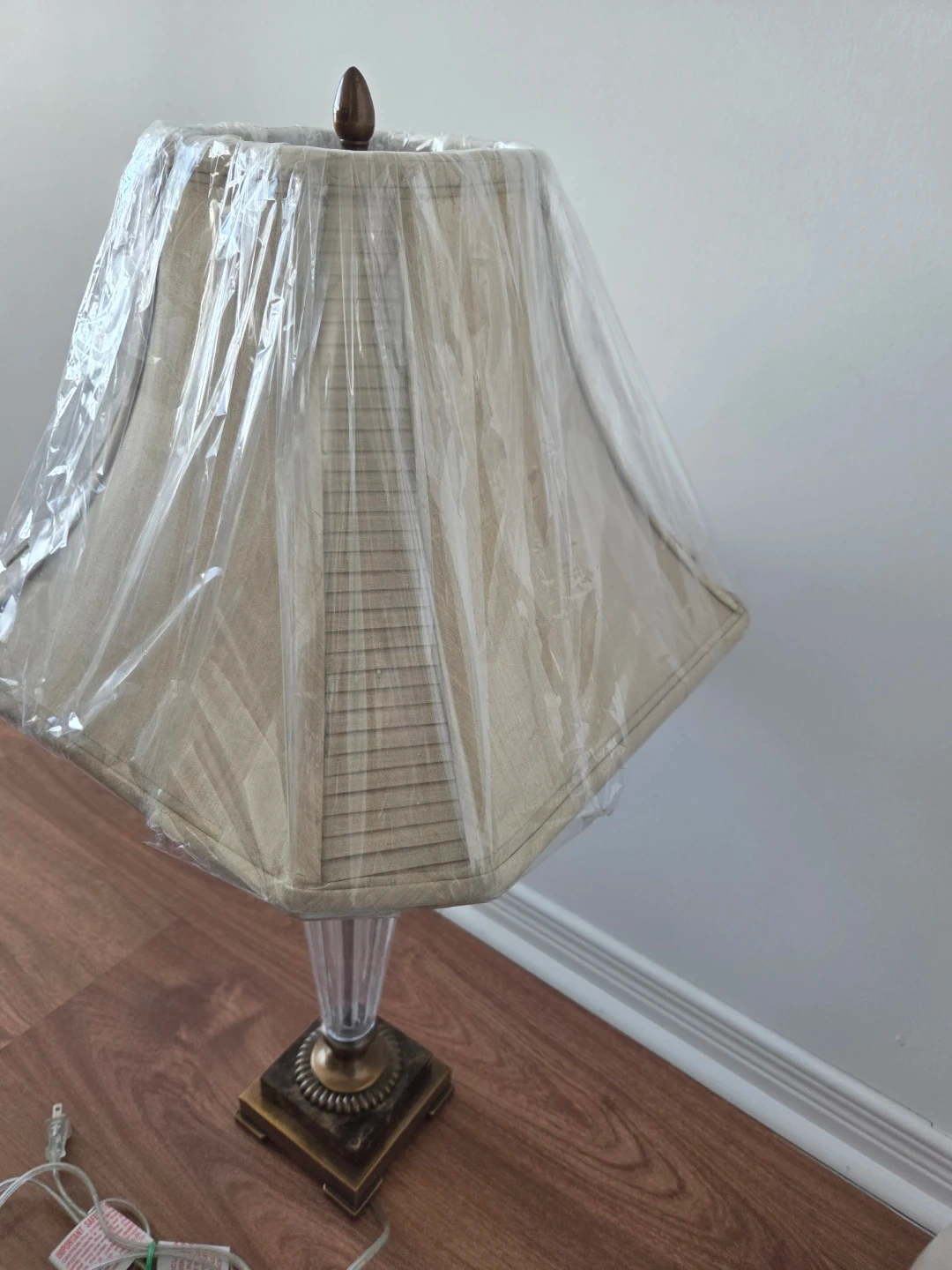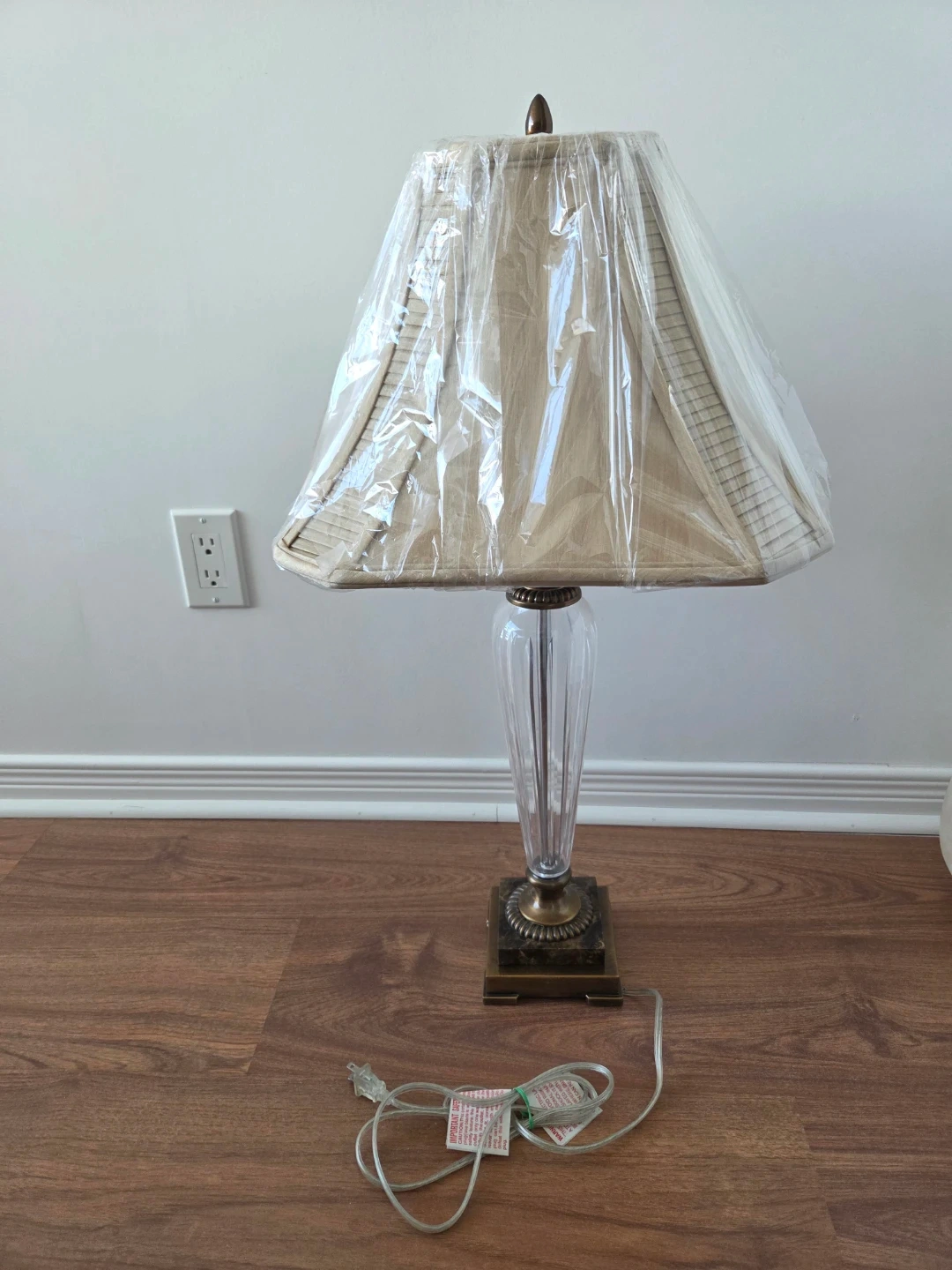 A stylish table lamp with a clear glass stem and a beige fabric shade. It's in great condition and ready to add a warm glow to any room. The base has a bronze finish with a marble accent.