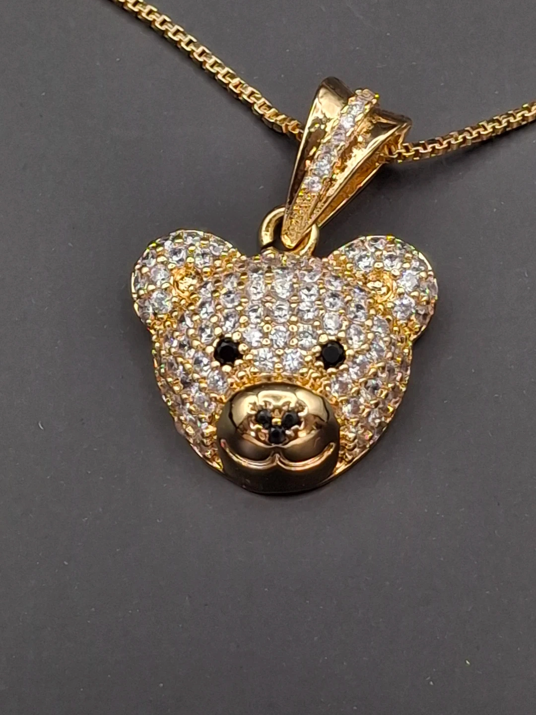 This set includes a gold-tone necklace with a teddy bear pendant and matching stud earrings. Both pieces are adorned with clear and black crystals. The chain is a delicate gold-tone link style.