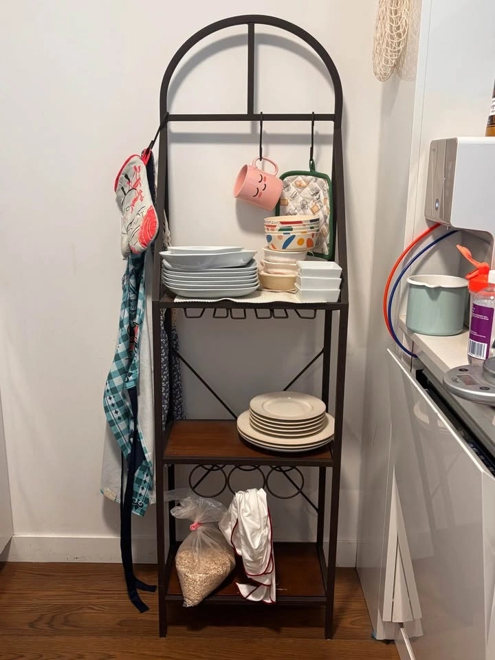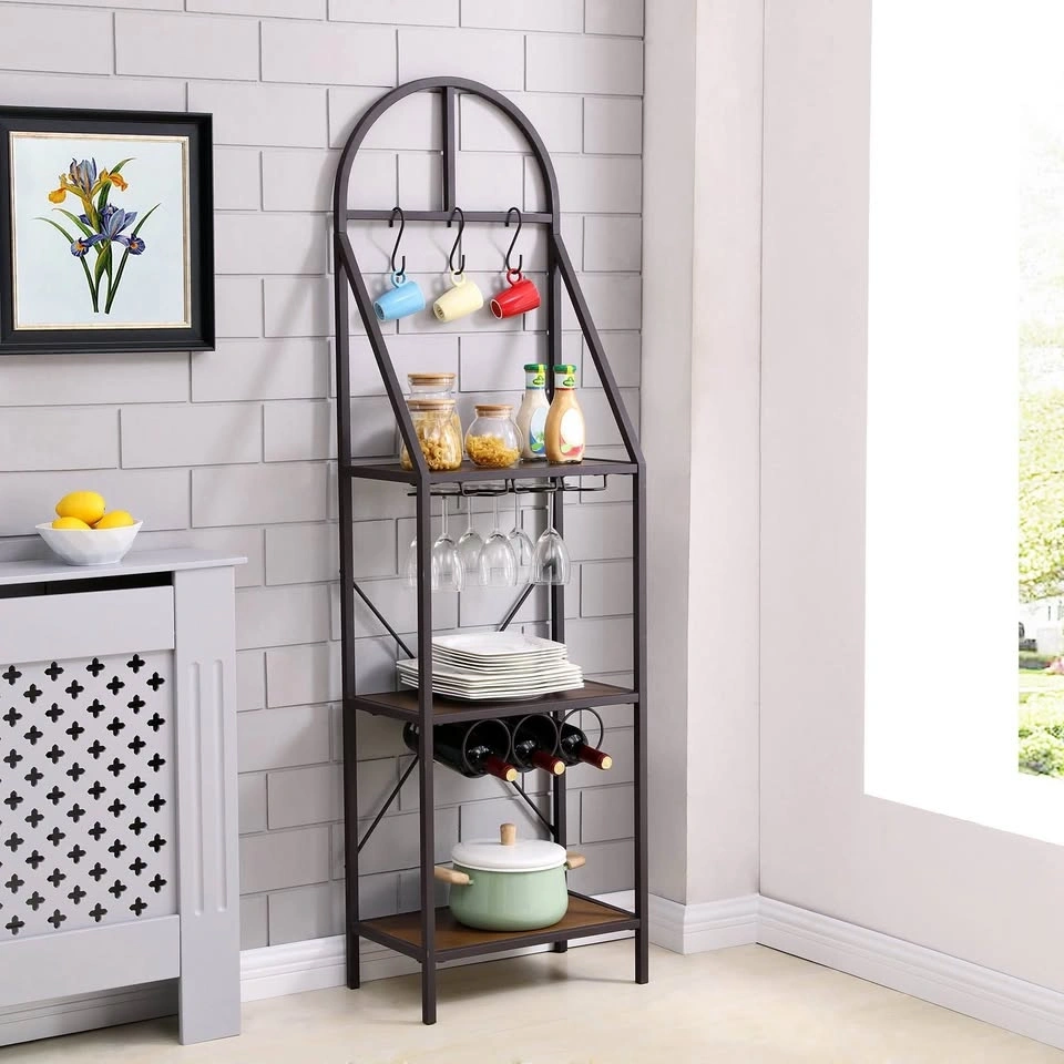 This Magaw Standard Iron Baker's Rack holds it all from wine glasses, bottles, to even a toaster! With a slender profile for smaller spaces, three dark pine shelves work for anything from dishware to consumables. Rustic brown metalwork makes the amenities of wine bottle and glass storage, and removable towel hooks, ideal for an open concept living space.