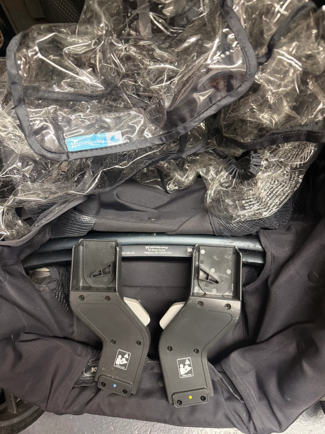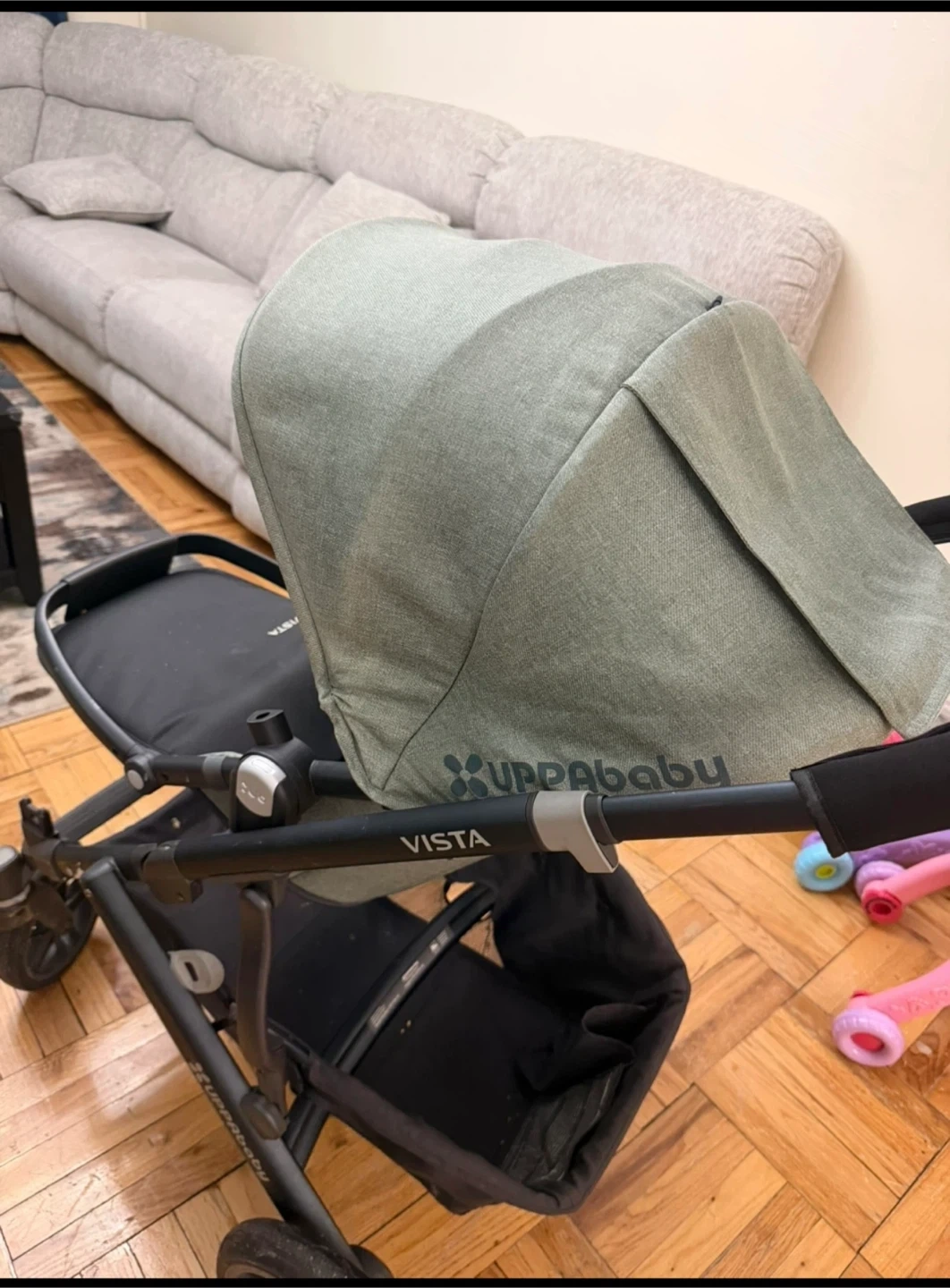 This is an UPPAbaby Vista stroller in a light green color. It includes adapters and a rain cover. It's a versatile stroller for everyday use.