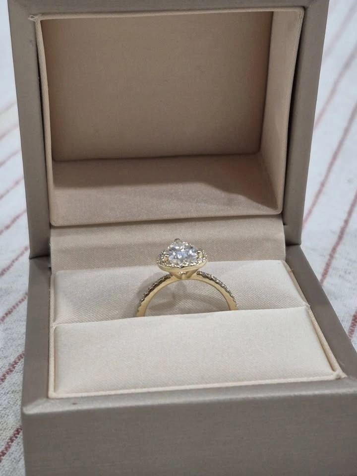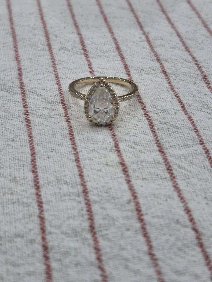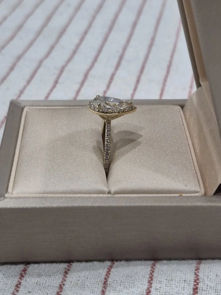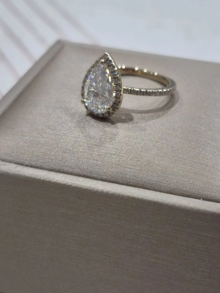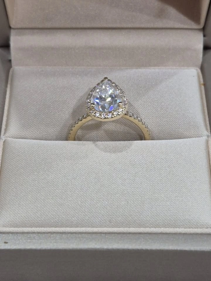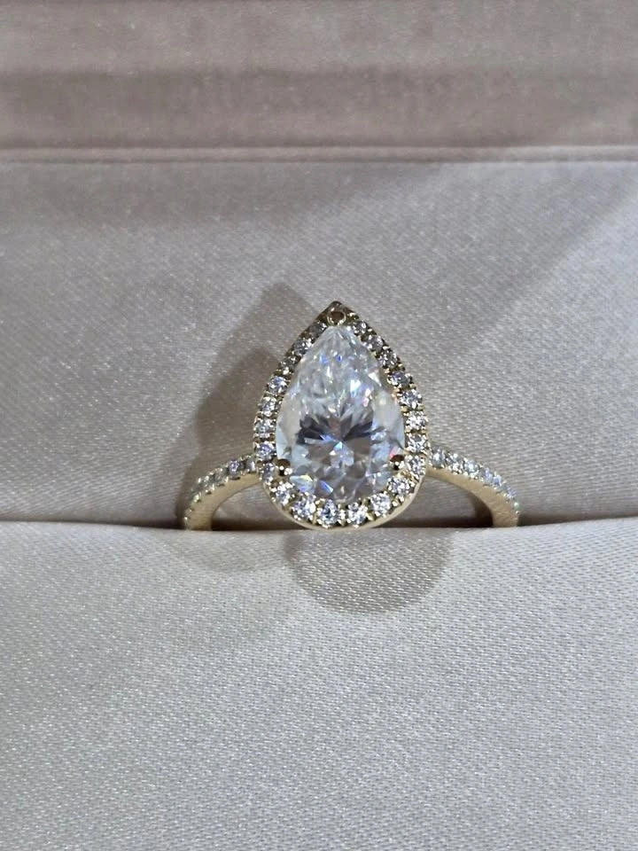 2CT Pear-Cut Moissanite Engagement Ring, exquisitely crafted in 14K yellow gold. Size 6.5. Accent stones are also moissanite. Crushed iced style. Pear Shape.