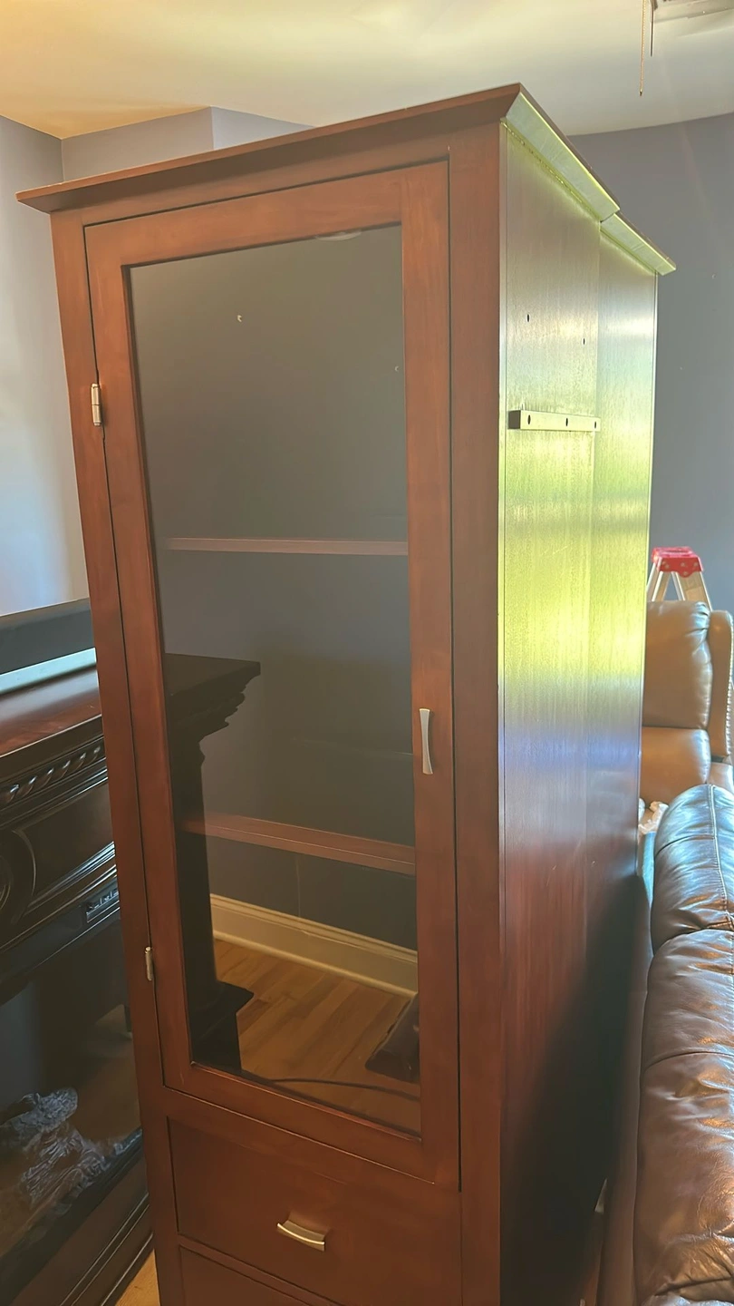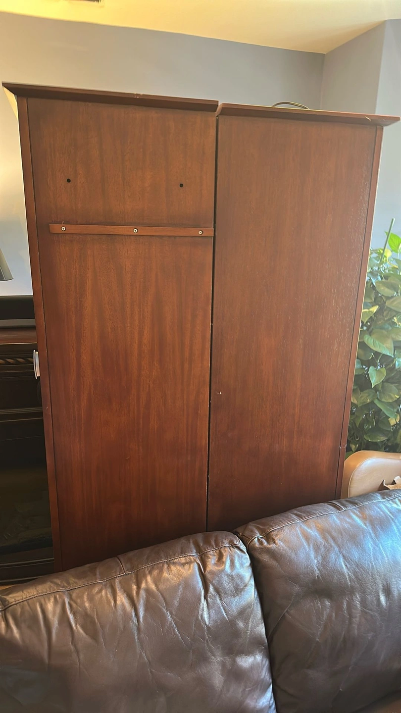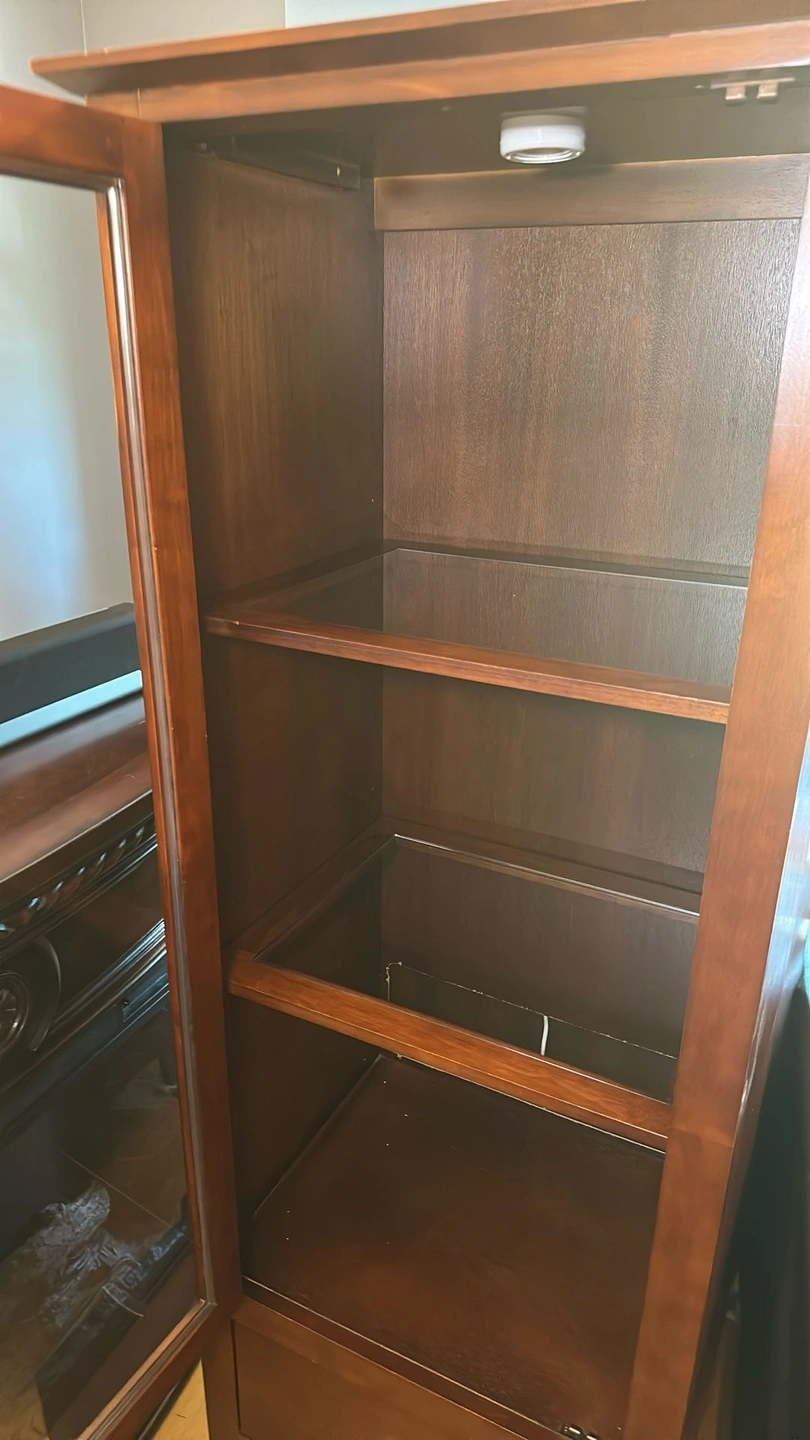 Solid wood two identical units with glass shelves. There is a space in bottom of one for wires. I did order a mirror which you can have (never installed). They both have lights at top which aren’t working at the moment, may need replacement. 74.5”x 22”x 17”