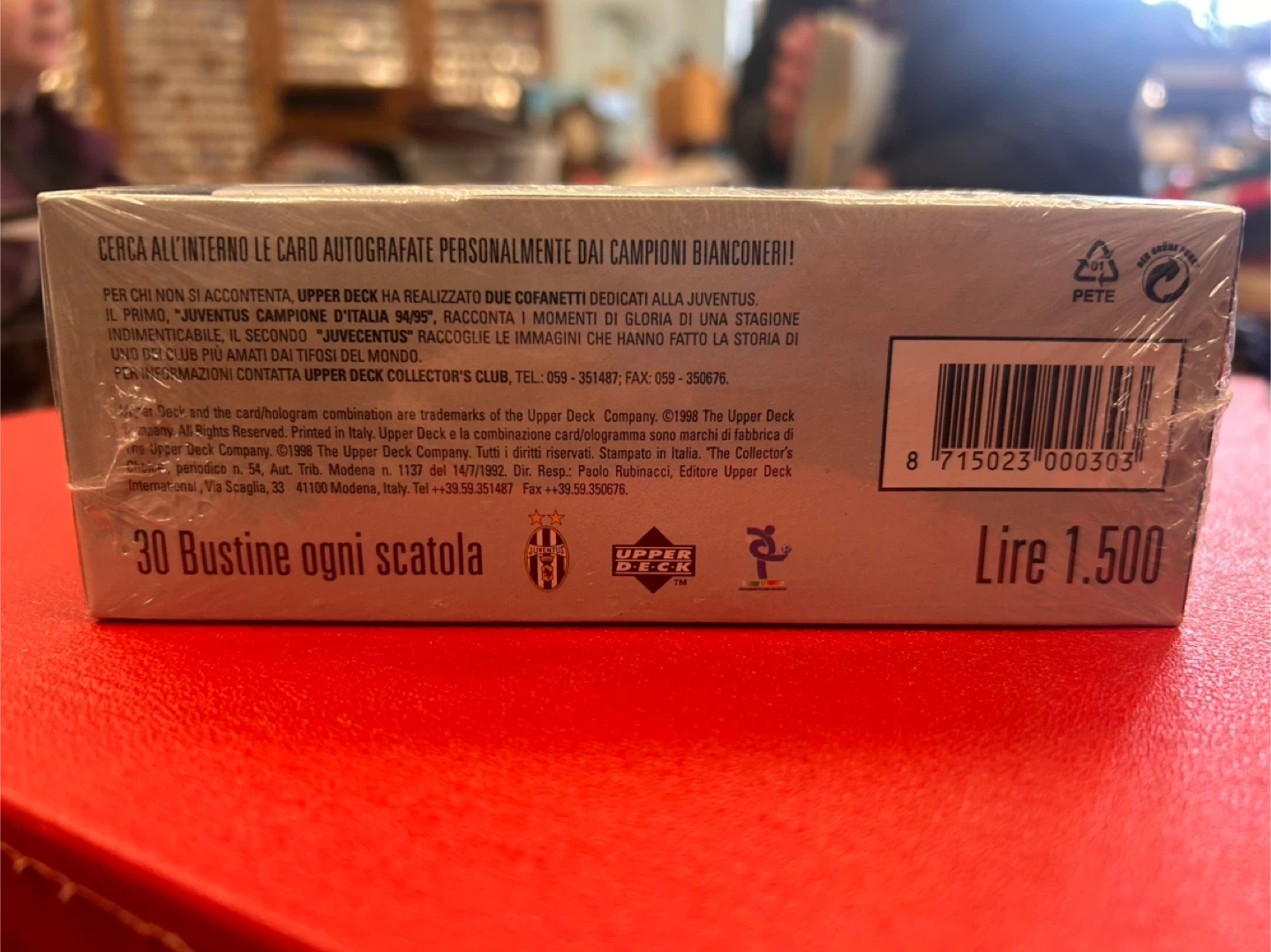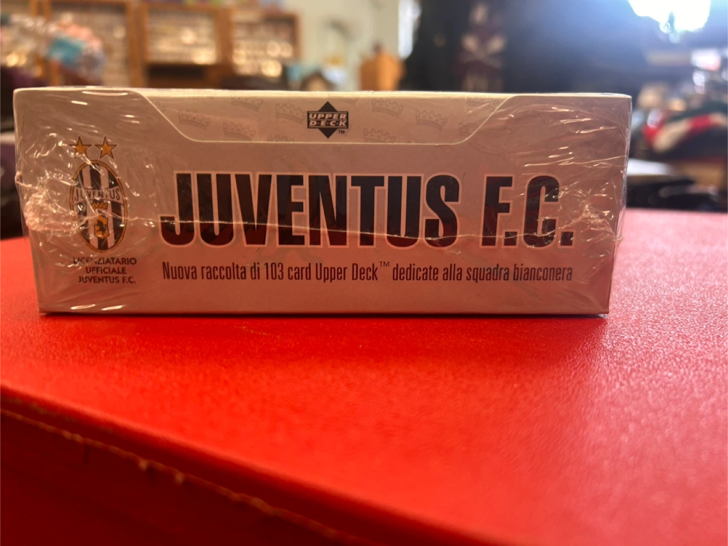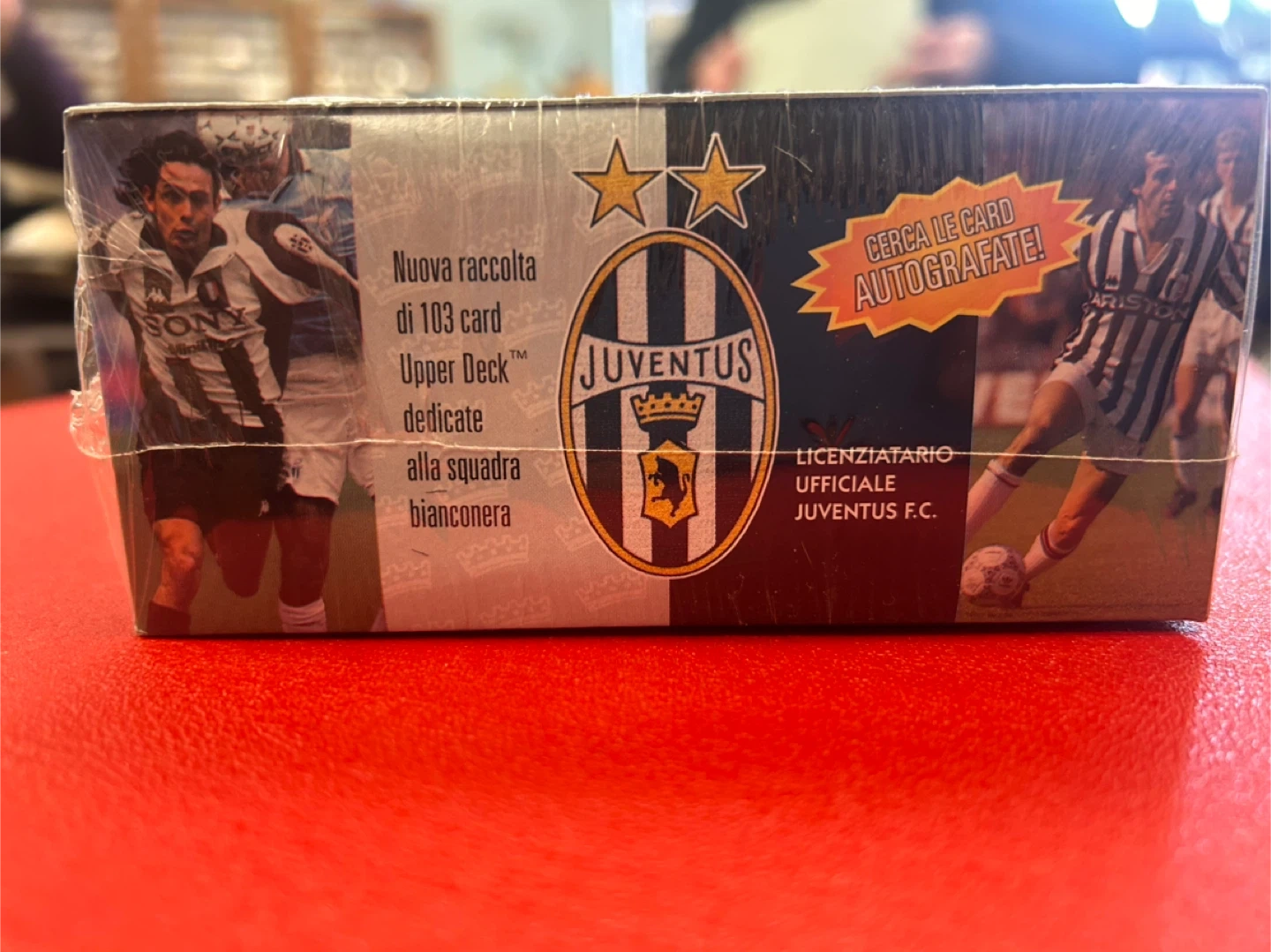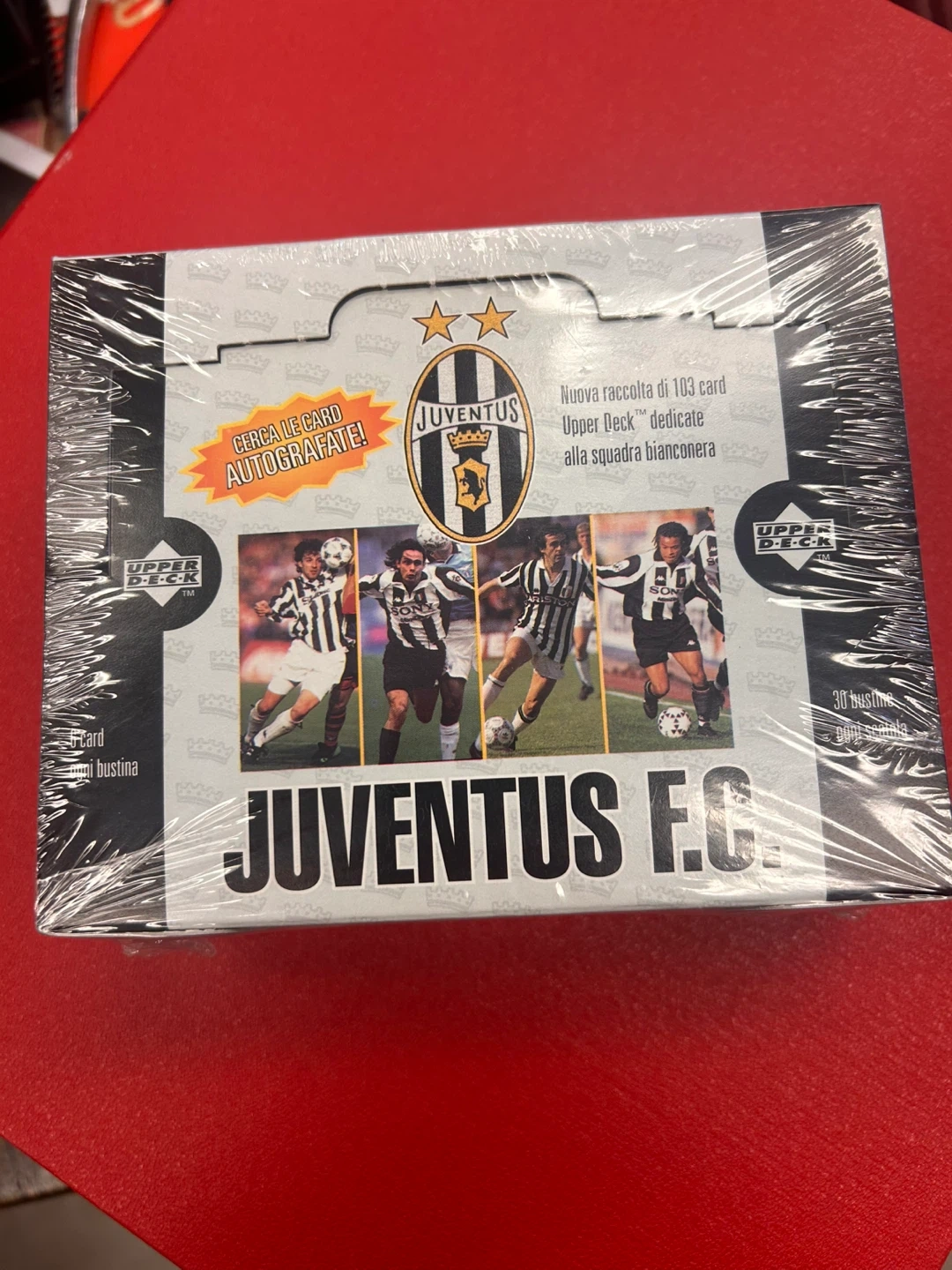 Factory-sealed 1998 Upper Deck Juventus F.C. trading card box. Officially licensed club release printed in Italy. This collection features 103 cards dedicated to Juventus, including highlights from historic seasons such as the 1994–95 Serie A championship. Box contains 30 sealed packs (“30 bustine ogni scatola”) with the chance to find autographed cards. Details: • Year: 1998 • Manufacturer: Upper Deck • Official Juventus F.C. licensed product • 30 sealed packs per box • Printed in Italy • Original factory shrink wrap intact A great collectible for Juventus supporters, Serie A fans, or late-1990s soccer card collectors. Light shelf wear to outer wrap consistent with age. Box remains sealed. Please message with any questions. Open to offers