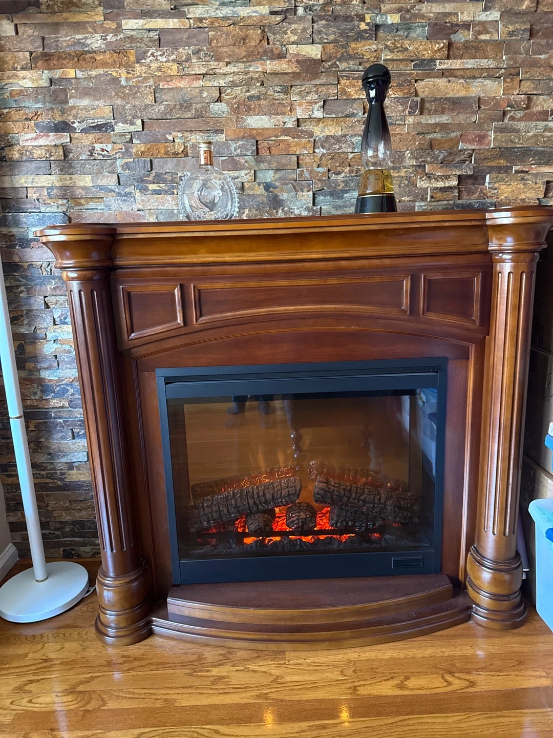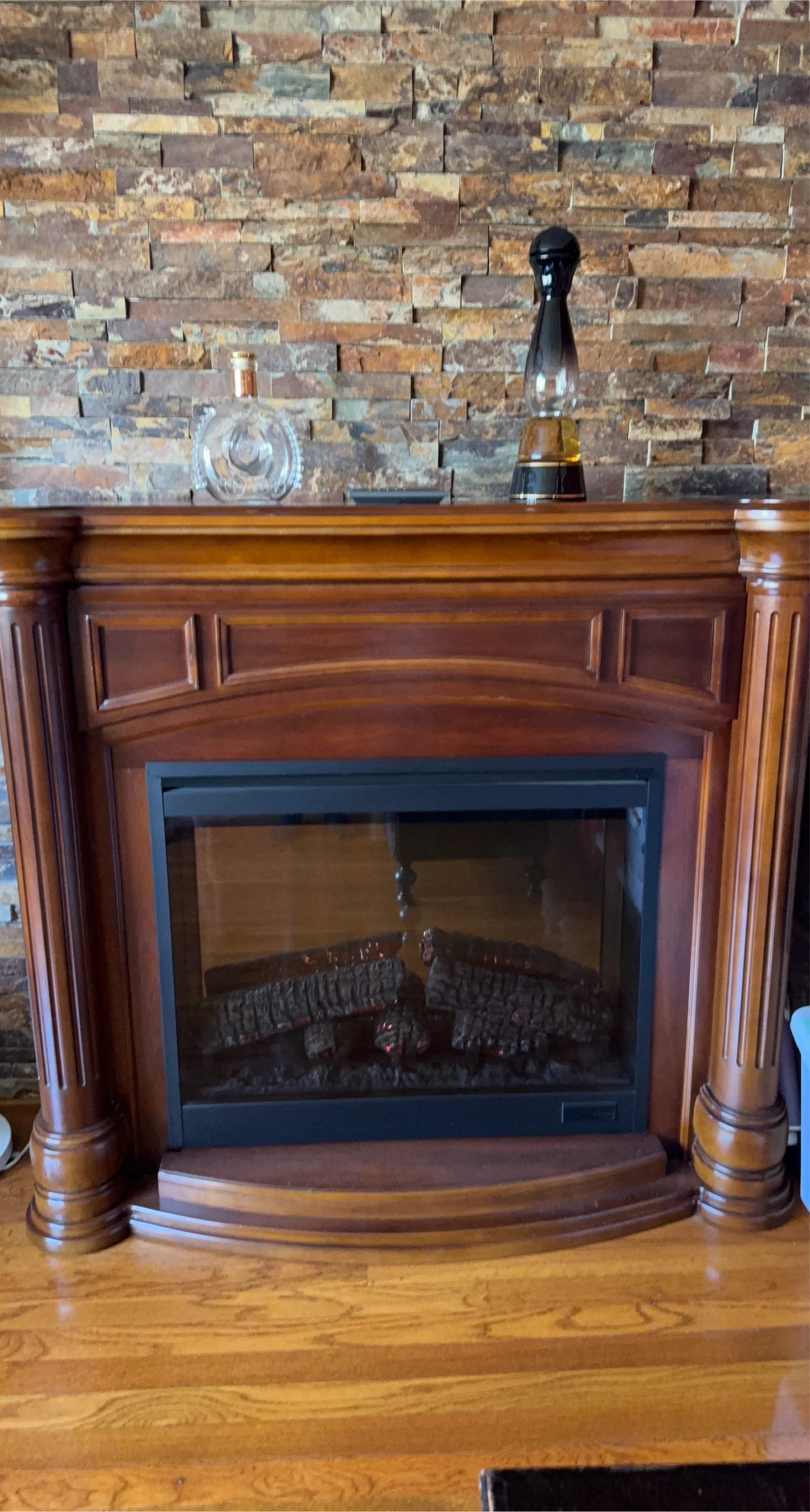 Electric fireplace with a beautiful wood mantel. It's in great condition and ready to add warmth and charm to your home