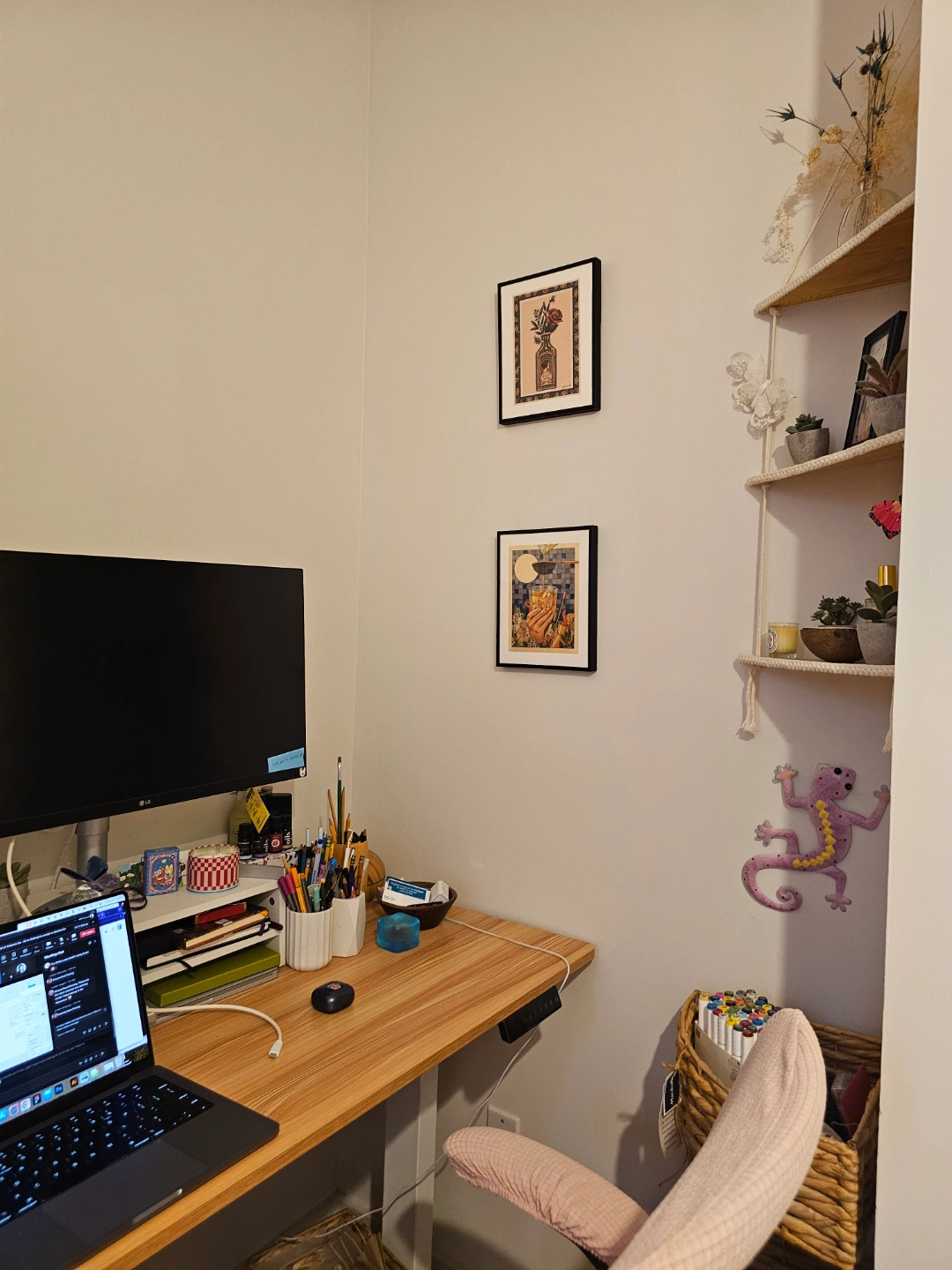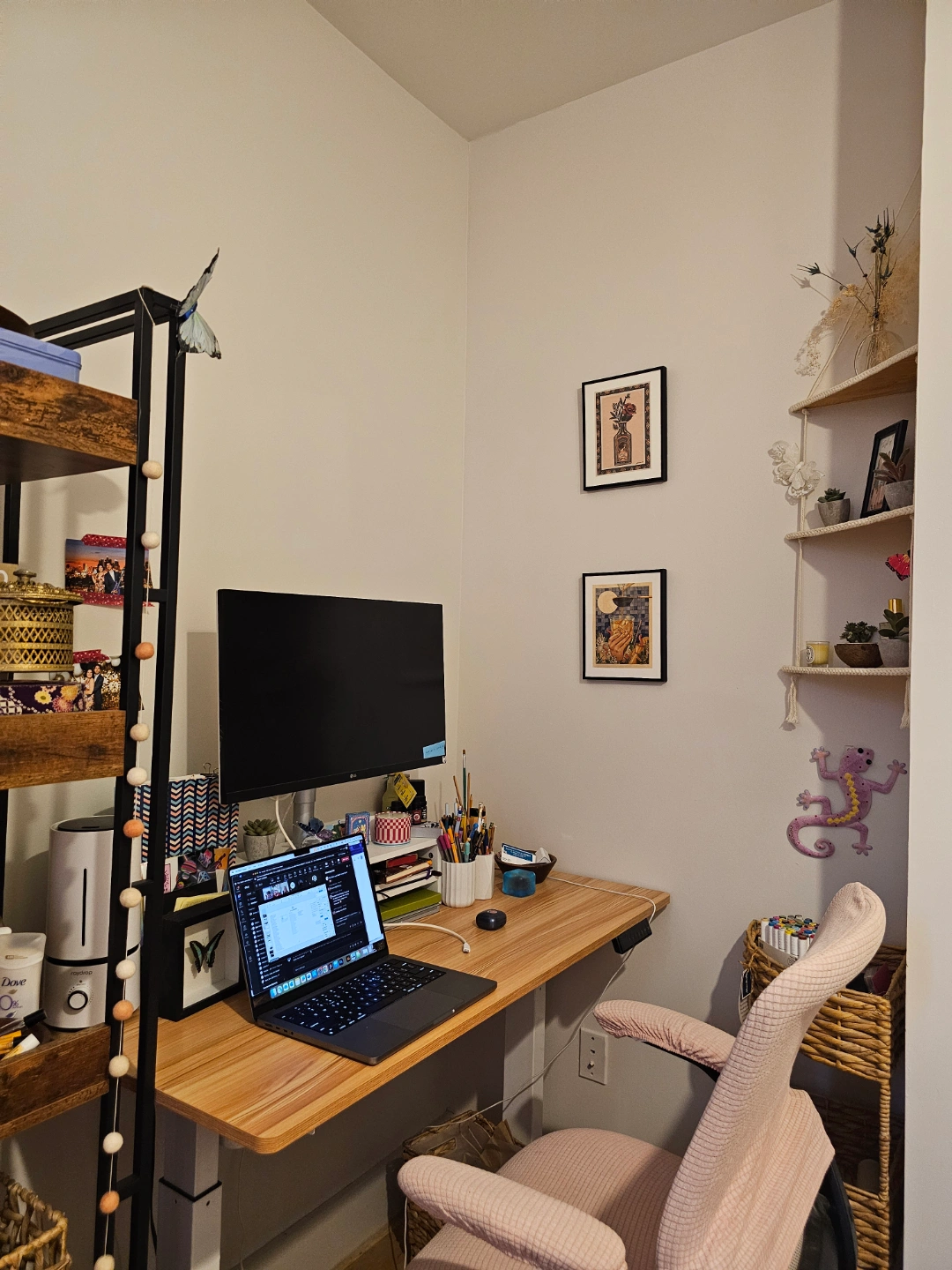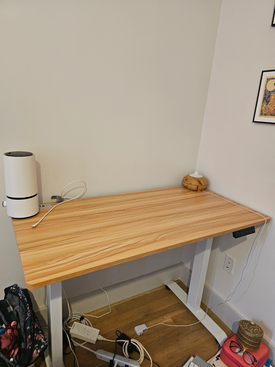 Electric standing desk, adjustable height. White frame, light wood top. Great for home office or workspace. Plenty of room for monitors, laptop, and accessories. Retails for 300.