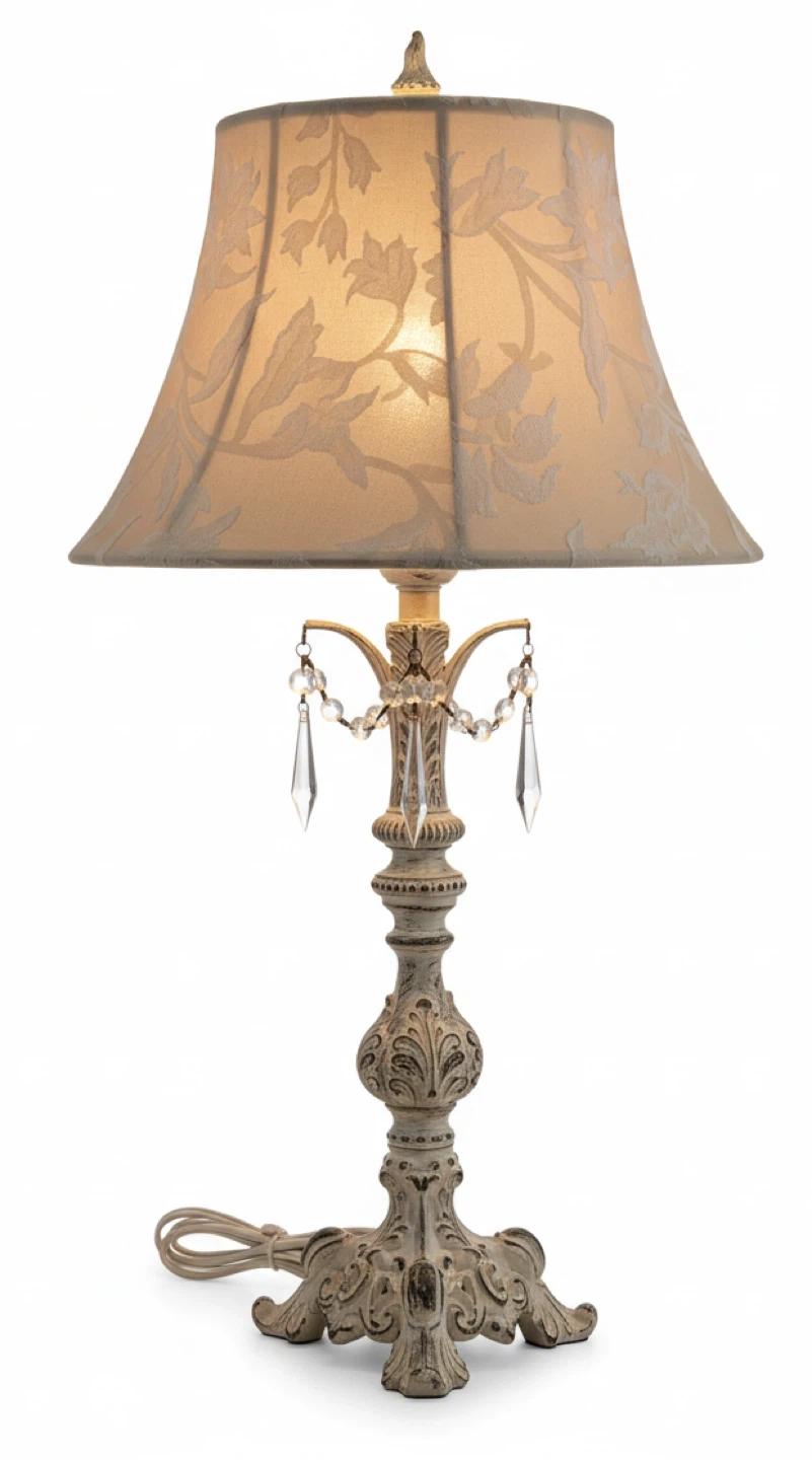 Selling a beautiful table lamp with a floral pattern shade. It features a decorative base with hanging crystal accents, adding a touch of elegance to any room. The lamp is in great condition and provides a warm, inviting light!