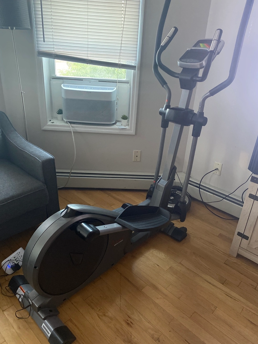 Sunny Health & Fitness Programmable 16 Electro-Magnetic Elliptical Cross Trainer Exercise Machine, Full-Body Cardio Equipment. Gray and black color scheme. Moveable has wheels. 330LB weight capacity- cheaper then its Amazon price