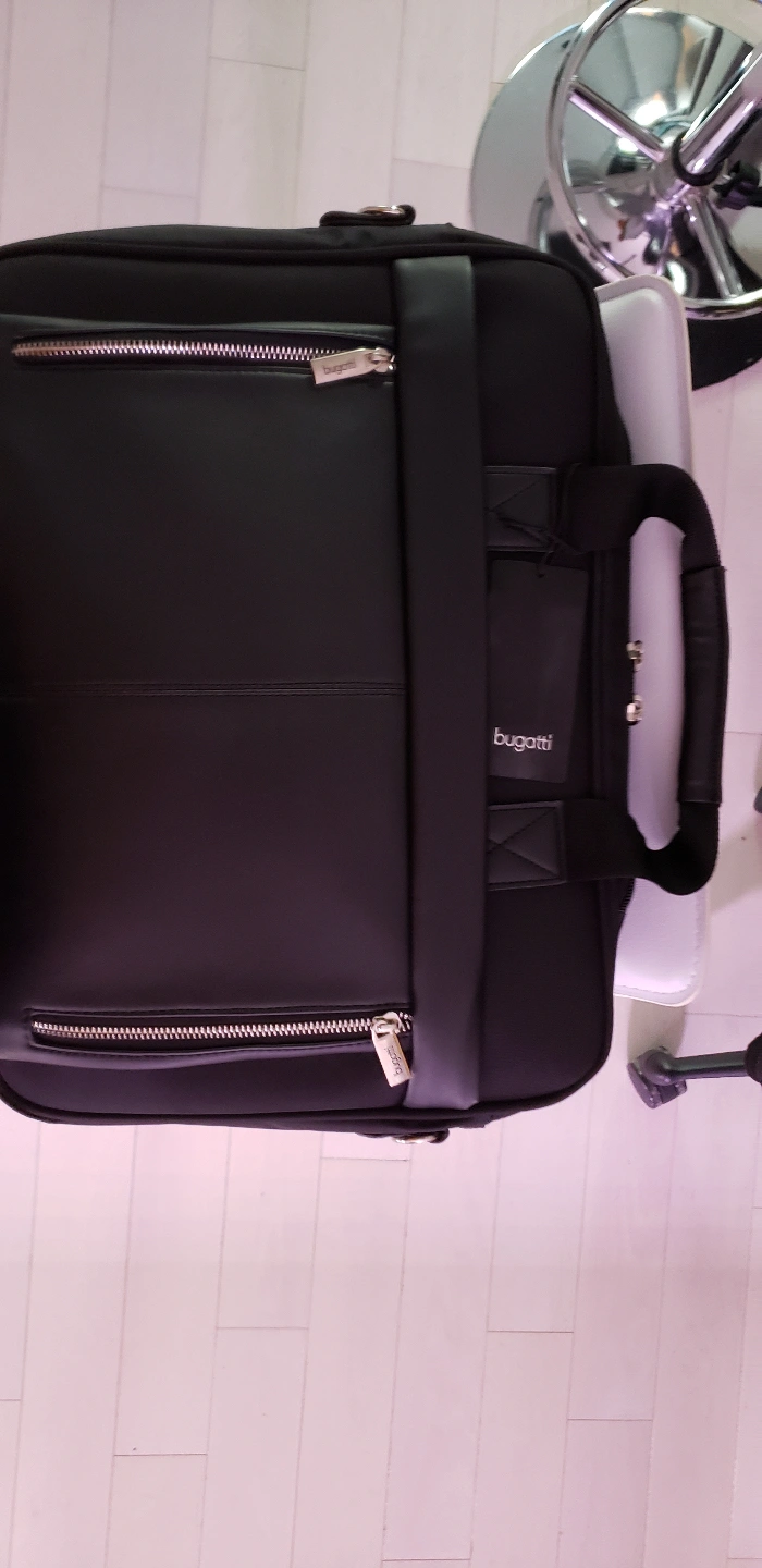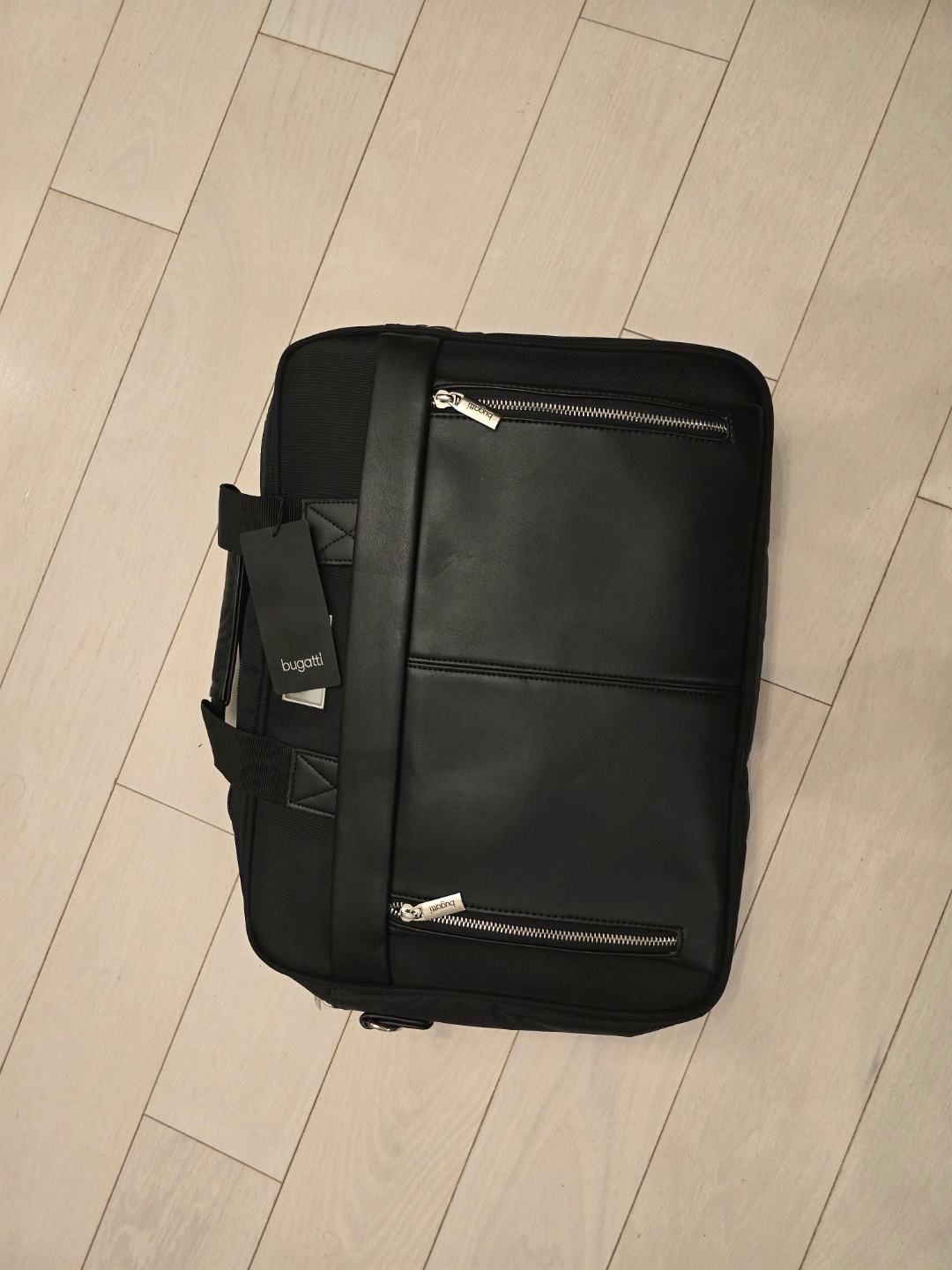 Stylish black briefcase. Features a zippered main compartment, and two smaller zippered pockets. Durable construction. Perfect for work or travel.