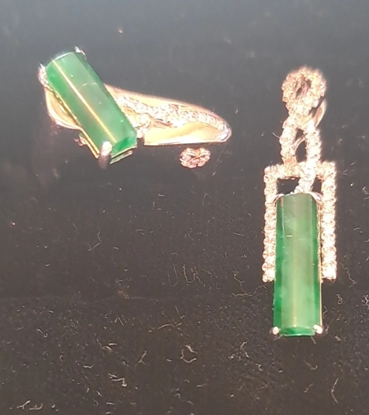 25Beautiful set of ring & Pendant featuring emerald green Jadeite and diamond accents. These are in great condition and ready to add a touch of elegance to any outfit