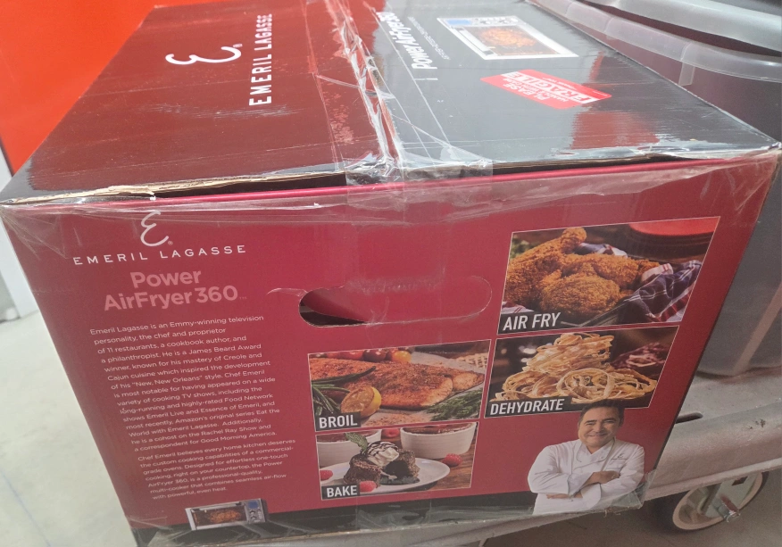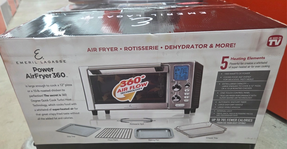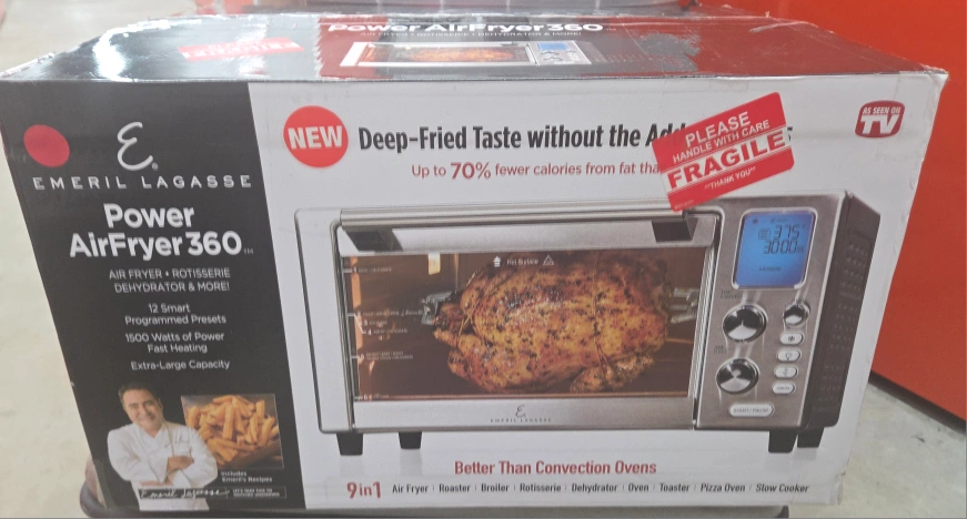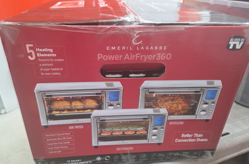 Selling an Emeril Lagasse Power AirFryer 360. It's an air fryer, rotisserie, dehydrator, and more! This appliance has 12 smart programmed presets and 1500 watts of power for fast heating. It also has an extra-large capacity. The box shows that it is up to 70% fewer calories from fat than deep frying