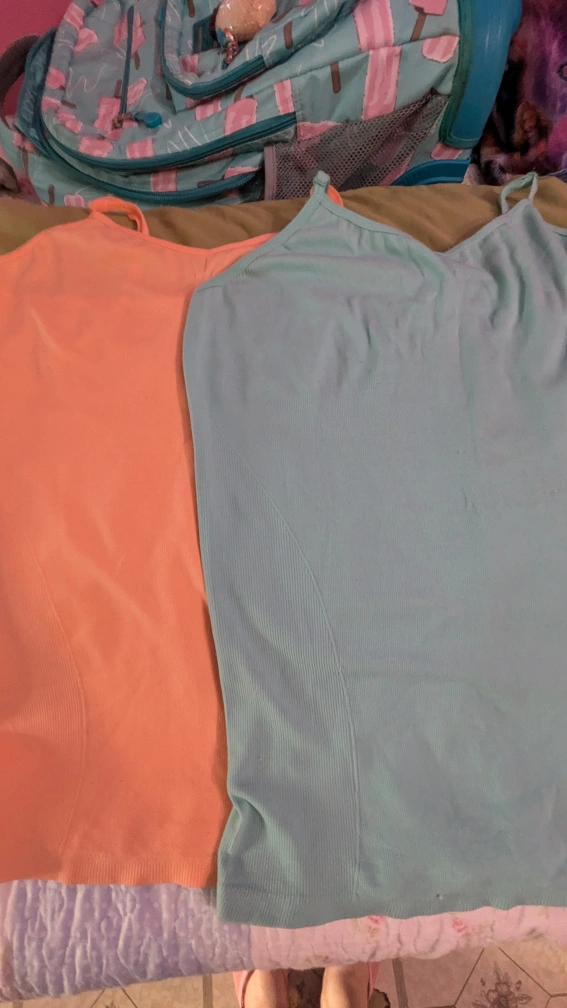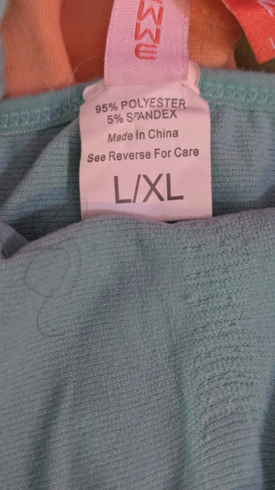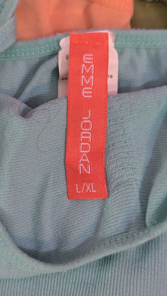 Selling an Emme Jordan tank top in size L/XL. It's made of 95% polyester and 5% spandex. The color is a light blue or mint green. Perfect for layering or wearing on its own