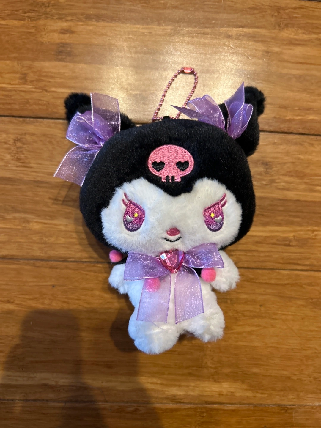 Super cute Kuromi plushie! It's in great condition and has a lovely purple bow. Perfect for any Sanrio fan! Has a small chain so you can use it as a key chain, hang it as decoration, etc
